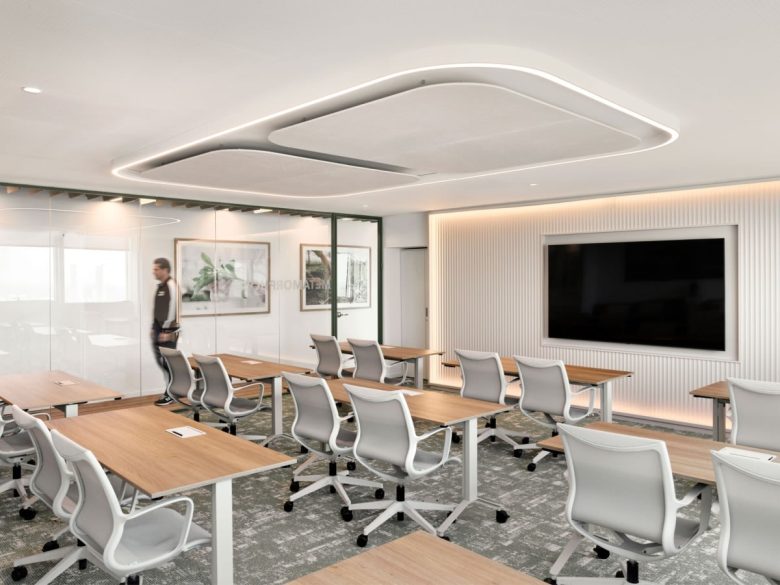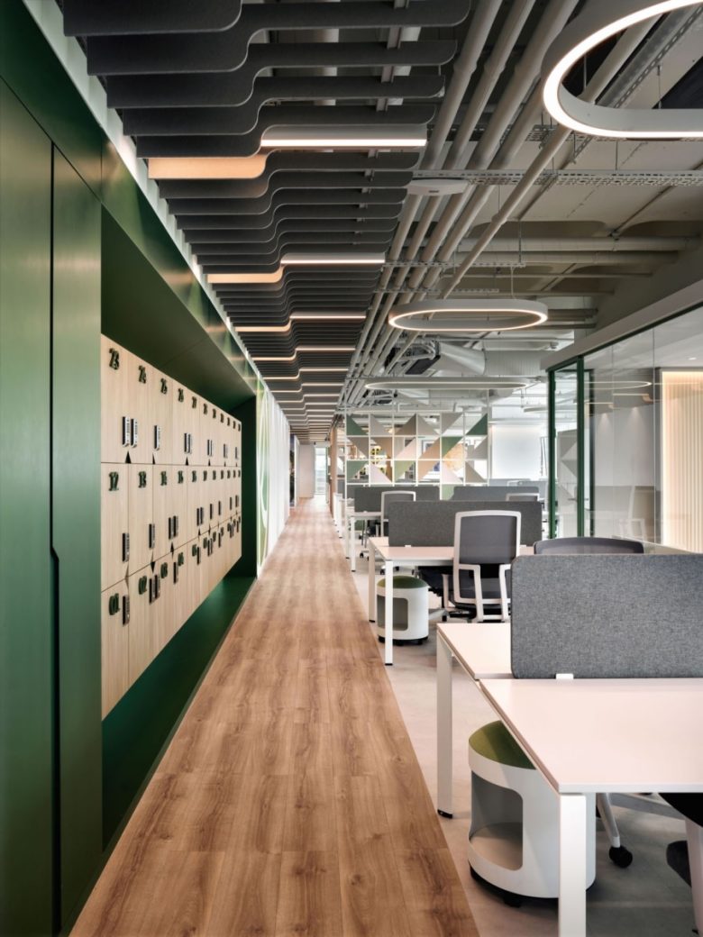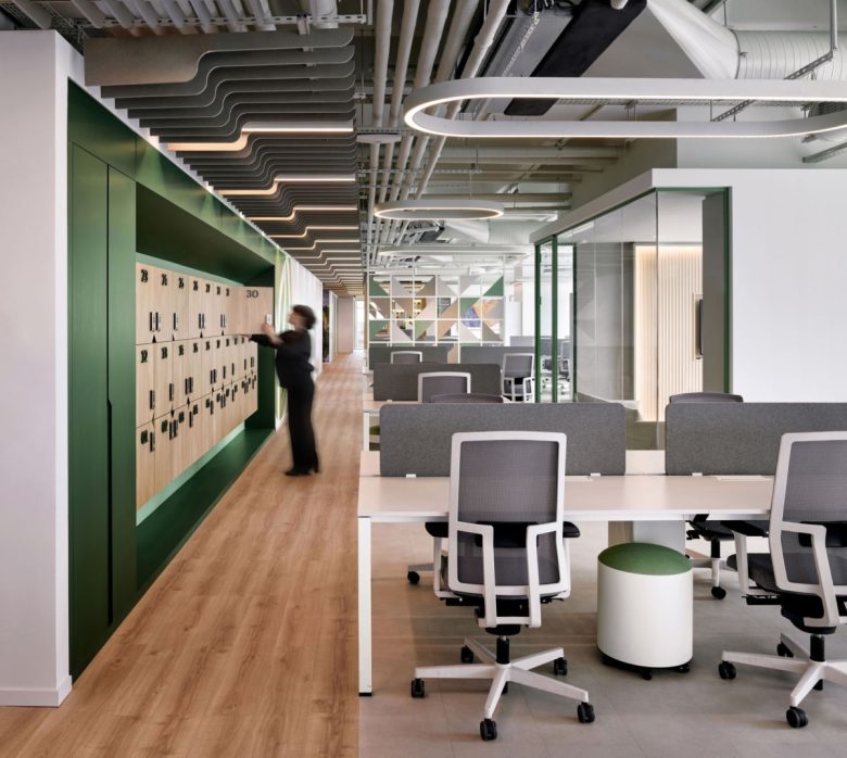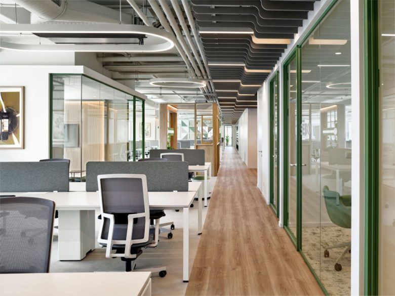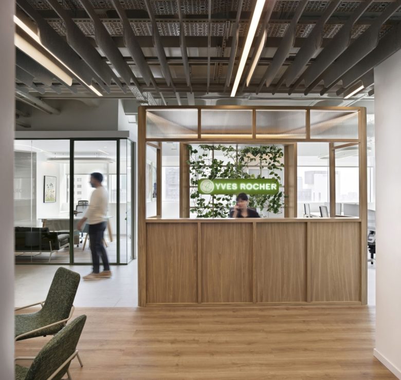 Enclosed rooms are arranged around the building’s core to preserve daylight in the open workspace. On the main floor, vertical acoustic panels reinterpret the Yves Rocher logo’s leaf motif, translating it into textured, functional dividers.