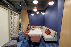The office also contains numerous acoustic booths and a large flexible hall for events, while a separate floor contains smaller rooms for in-depth work. Alongside these more traditional workspaces, Zeller & Moye continued the theme of integrated planters with an indoor garden and a “felt landscape”.