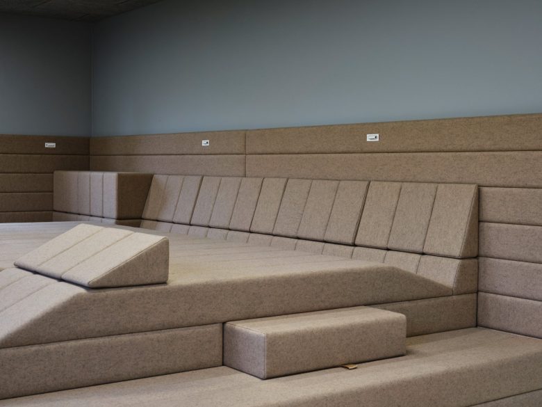 The studio worked with German artist Tilo Schulz to create the seating area, which has movable, felt-covered pieces that can be reconfigured into various positions. “The felt landscape was created as a contrasting setting to the chair-table-based work areas,” said Moye. “The walkable landscape allows for working in relaxed positions, comfortable seating, and even sun-bathing below the two windows,” she continued. “The upholstered surface makes for a positive irritation when walking over it, gently suggesting a shift in thinking.”