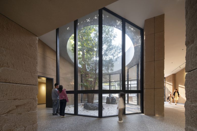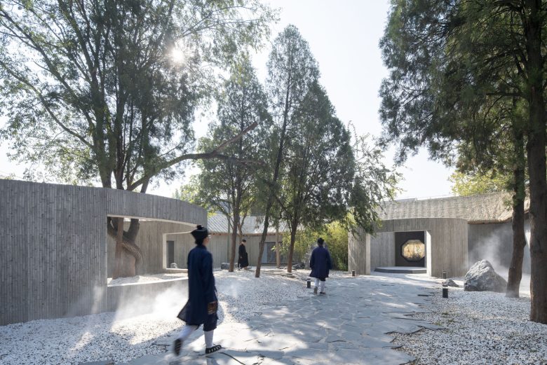 The circular corridor serves three spatial functions: First, as an integrator of historical fragments, it weaves scattered structures—gatehouses, granaries, monastic cells, and the Lv Gong Shrine—along with the 12 native trees—into a cohesive ensemble centered around a garden. Its layout adapts to the existing trees, with key focal points highlighting preserved specimens such as the intertwining Elm and Mimosa, while a mist-spray system enhances the ethereal, otherworldly ambiance.