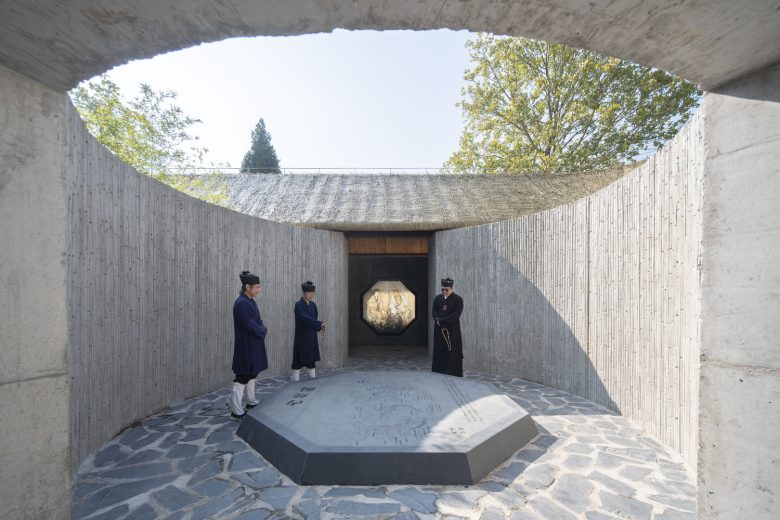 The introductory hall of the exhibition space encircles two preserved native trees, while the main hall occupies two-thirds of the original granary structure. The eastern portion of the granary – which had encroached upon Yongle Palace’s historic boundary – was deliberately removed, preserving only fragments of the north and south walls. This intentional eastern opening channels visitors into the relic site. Where the granary was dismantled, a series of winding glass walls now stand on the demolished site. Etched with images of Taoist immortals in the mural, these transparent barriers acquaint visitors with the celestial pantheon before they enter the sacred archaeological site.