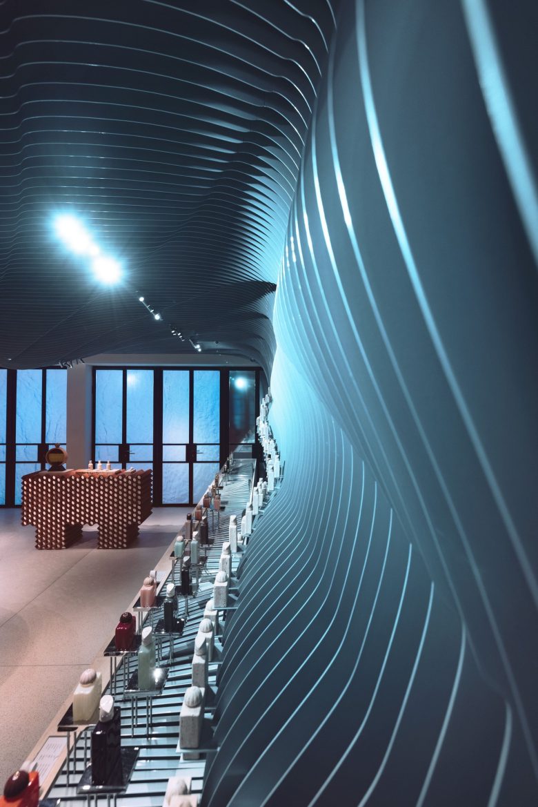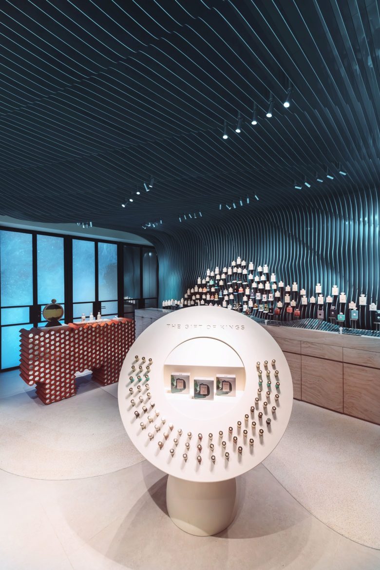 The boutique is entirely plastic-free, crafted from locally sourced stone, wood, metal, and glass. Even the sculptural turquoise ceiling—made of thin metal blades—was assembled on-site to reduce environmental impact. Héroïne avoided all temporary POS displays, designing a space where architecture alone glorifies the product.