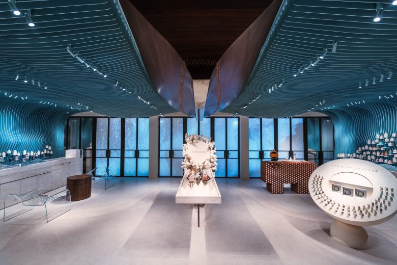 Héroïne conceived the space as a contemporary fable, drawing inspiration from the legend of Sindbad the Sailor. A sculptural black-and-gold façade marks Amouage’s first intervention at an architectural level—transforming the street presence with light, geometry, and anticipation. Inside, kinetic fragrance displays mimic the rhythm of ocean tides, while coral-inspired sculptures, a suspended wooden dhow hull, and caustic light projections compose a dreamlike underwater world.