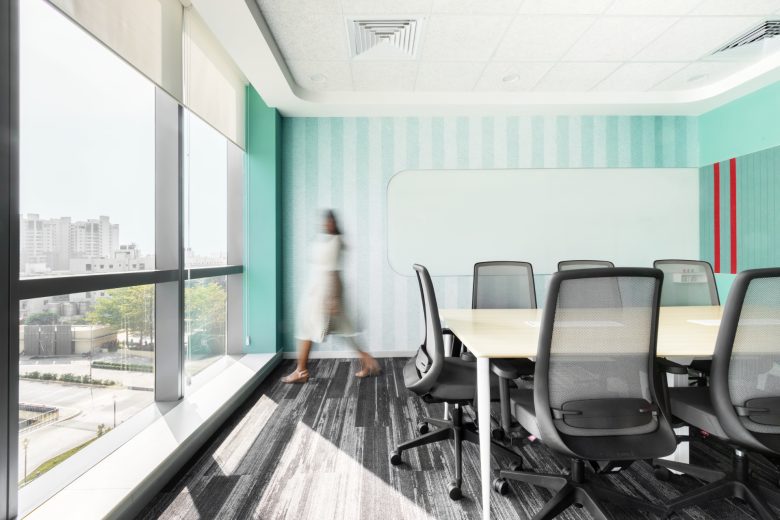 The workspace evolves into dynamic neighborhoods with swing seats, biophilic buffers, and café-style cafeterias. Even meeting rooms, while formal, maintain visual ties to the outdoors, ensuring the entire space resonates with the ‘open-in-nature’ narrative.