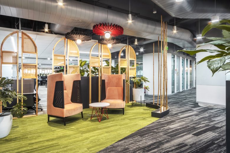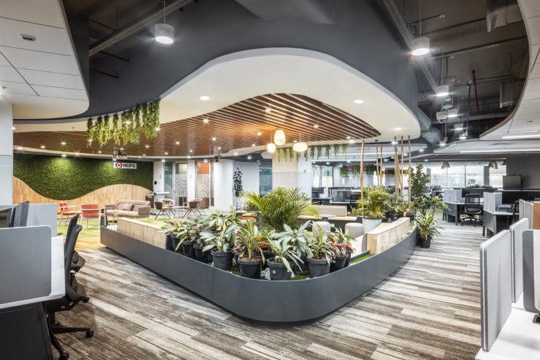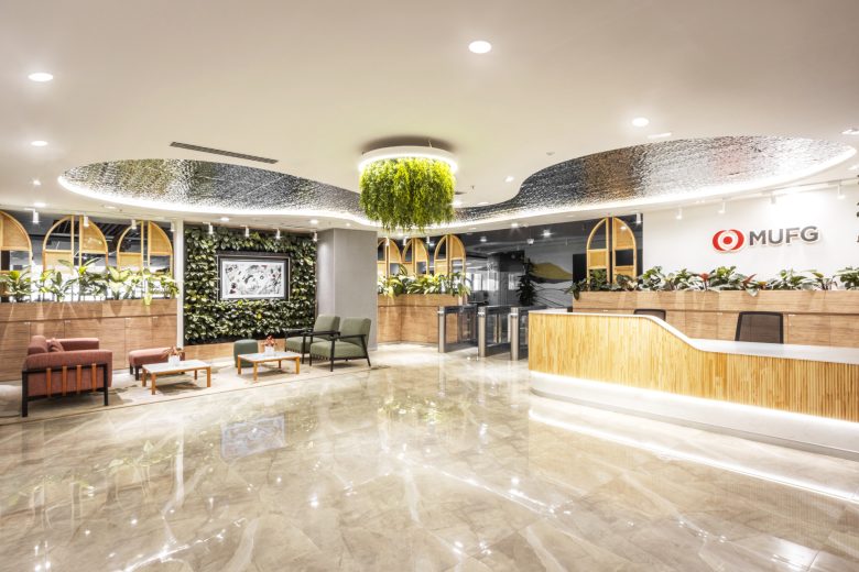 The design takes cues from Bengaluru’s green heritage, integrating biophilic principles through bamboo, cane, rattan, and reclaimed wood. Zen gardens, acoustic nooks, and lush elements foster tranquility and productivity, while carbon-neutral materials underscore MUFG’s environmental values.