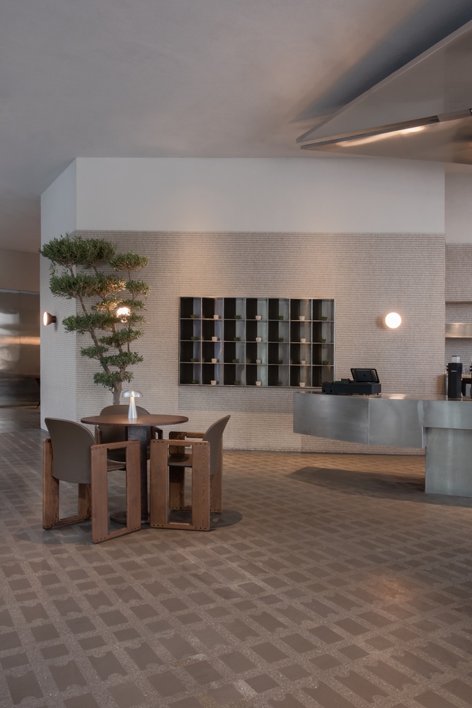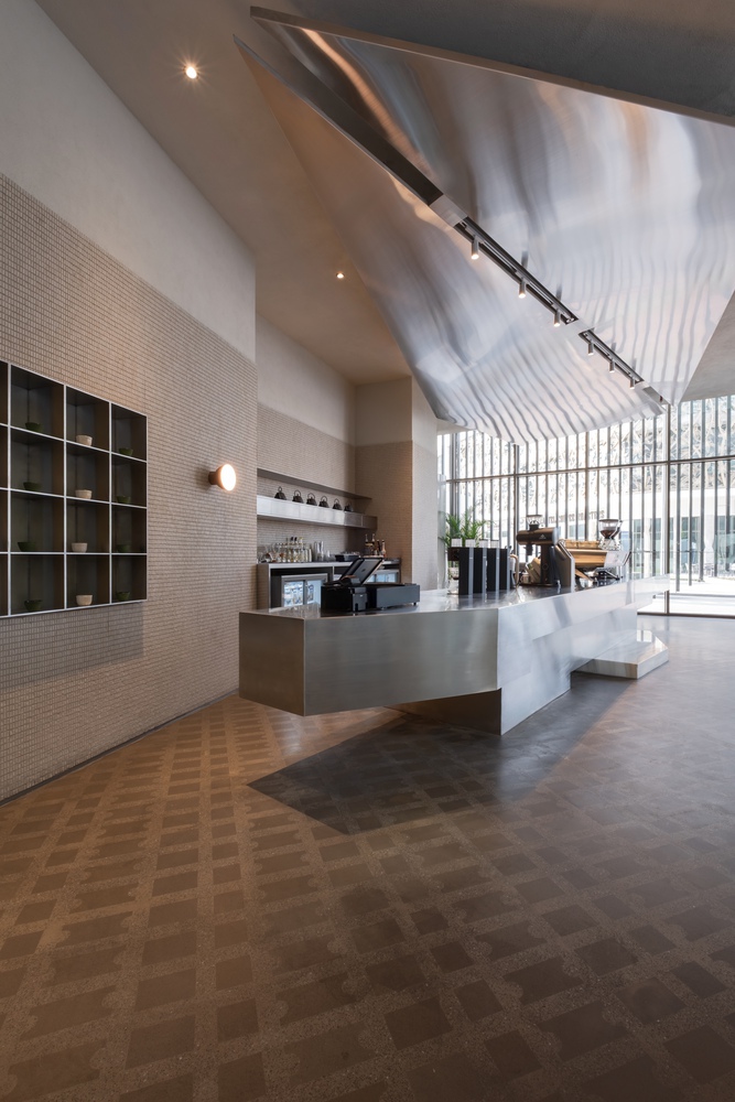 The design draws from the raw qualities of nature, expressed through tactile materials and forms inspired by the landscape. A continuous wall wraps through the space, acting as a unifying element within the interior. Referred to as the “datum wall,” this surface serves as a backdrop for the key elements of the café.