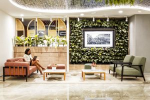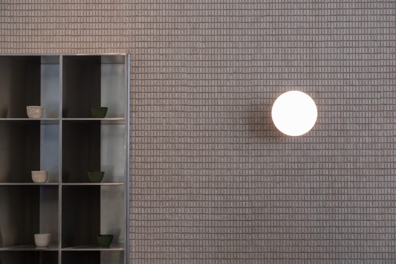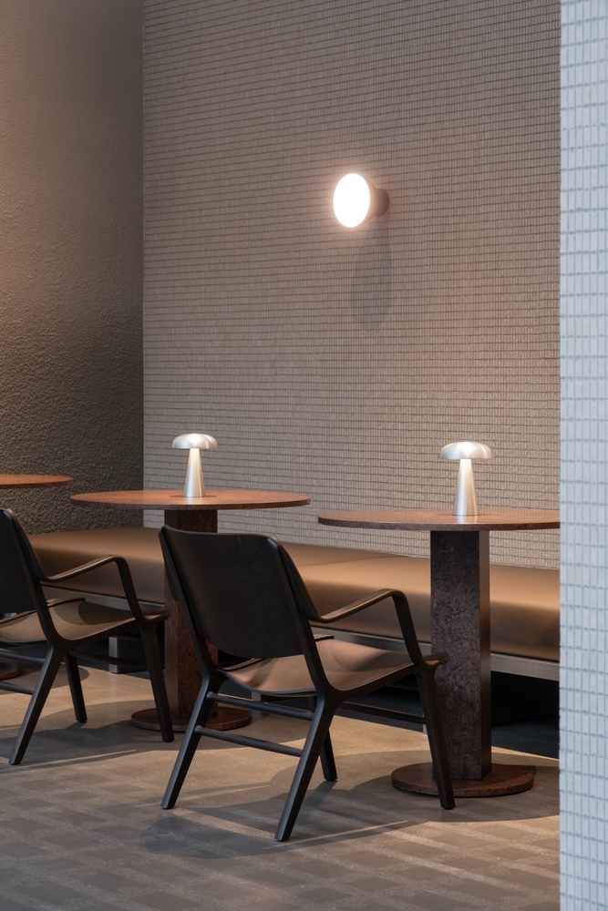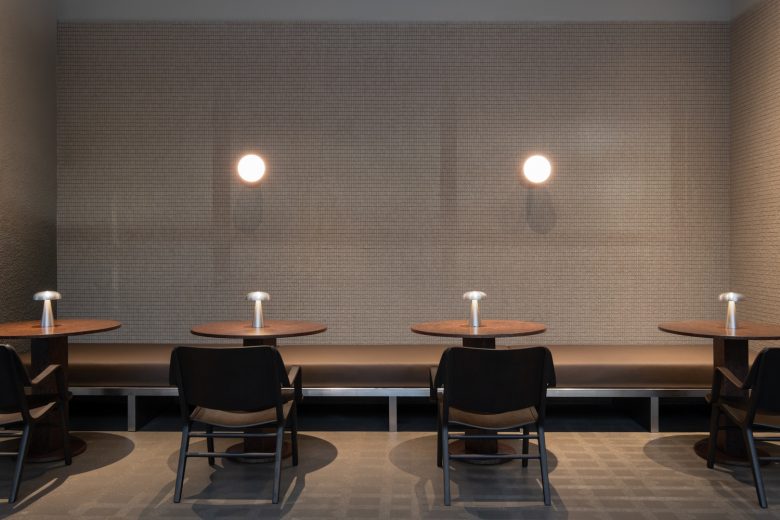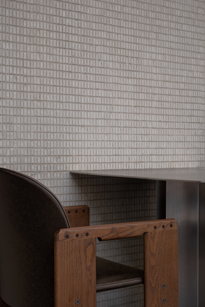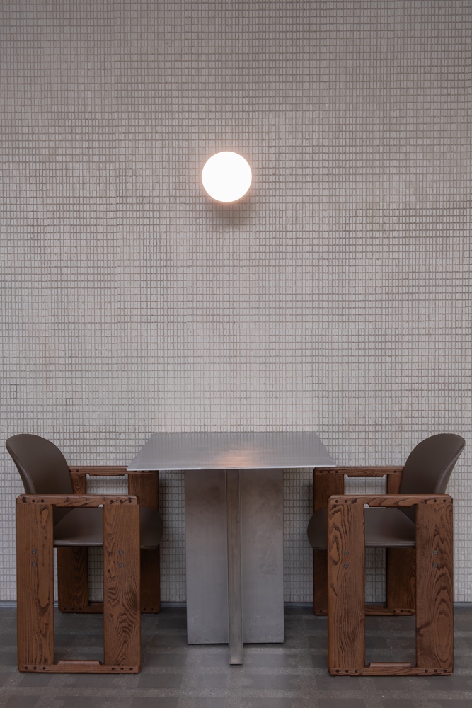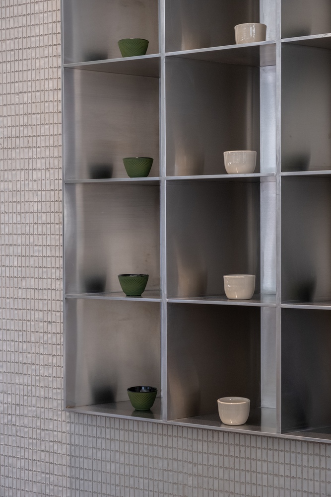 Material transitions throughout the space are treated with consistency and precision. The recycled tile walls introduce depth and tactility, while the muted floor tones ground the overall palette. Wood accents in the chairs sit alongside stainless steel tables, creating a quiet balance between warmth and coolness. Every detail has been intentionally crafted to echo the brand’s character and the landscape that inspired it, resulting in a calm, cohesive space rooted in its origins.