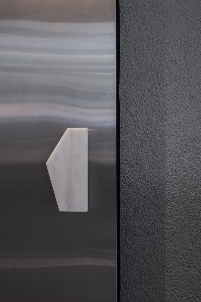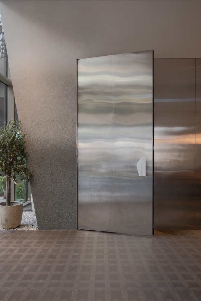 It is finished with rough-textured tiles made from recycled glass and porcelain, offering a distinct surface that contrasts with more refined, industrial treatments such as brushed stainless steel. This contrast between warm, unpolished finishes and cooler, sleek materials establishes the tone of the interior palette.