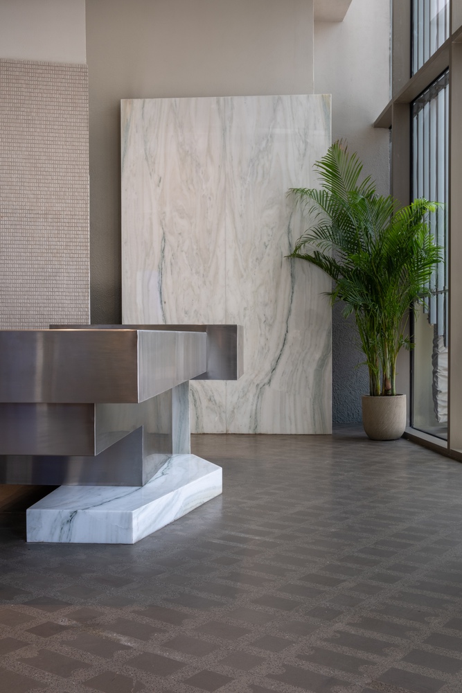 Several custom-made elements were developed specifically for this branch, including the flooring, which features a site-specific design composed of cut stone elements combined with cast terrazzo, forming a subtle pattern that ties into the spatial rhythm of the interior.