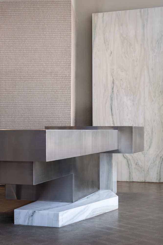A sculptural coffee counter anchors the space, functioning as both the operational core and a visual statement. Its composition references the idea of balancing stones in nature, with solid marble volumes supporting polished stainless steel forms arranged in a deliberate yet seemingly weightless configuration.
