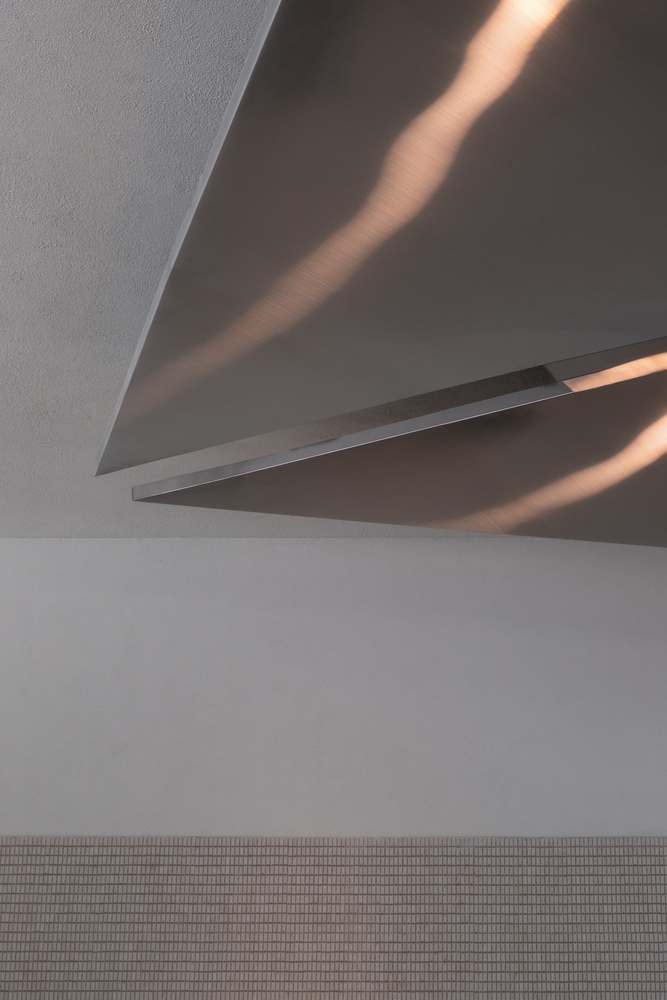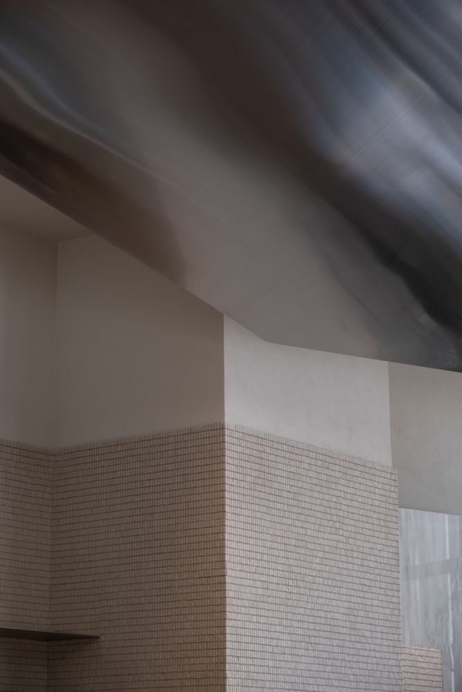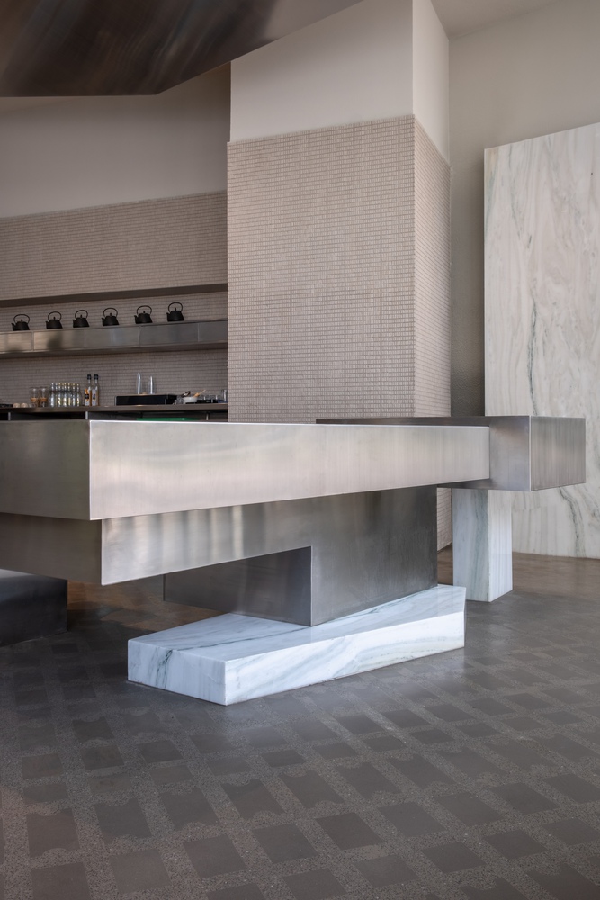 The counter is slightly lifted off the ground, enhancing its monolithic quality while adding a sense of lightness. Suspended above, a custom stainless steel canopy mirrors this composition, softly reflecting light and motion, and reinforcing the dialogue between heaviness and elevation.