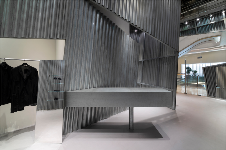These elements create a unique striation pattern that’s reminiscent of geological layers. For the store setting, all of the aforementioned has been translated into hand-galvanised corrugated steel sheets. The sheets have been placed in a playful and seemingly gravity-defying configuration, which not only demarcates the store perimeter, but also meanders across the premises, creating visually interesting nooks and perspectives. Allowing the quirky configuration to take centre stage, furnishings are few and simple, comprising of panel-mounted glass shelving and clothing racks, and semi-attached display counters. The new Yohji Yamamoto boutique carries a curated selection of women’s and men’s items from the lines Yohji Yamamoto, Yohji Yamamoto POUR HOMME, and discord Yohji Yamamoto. © superfuture