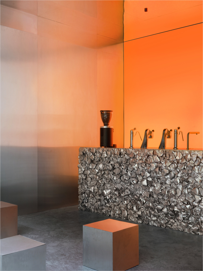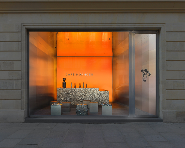 The interior design, created by Crosby Studios, a forward architecture and design practice based in the French capital and New York City, offers a stark contrast with the building’s limestone façade. Here, stainless steel rules gloriously, captured not only by large panels covering the side walls and ceiling, but also by the furnishings. Mind you, the service counter front and some seating cubes are adorned with crushed metal pieces which further elevates the spatial experience. The back of the café is entirely lit, in bright orange, to be precise, boosting the café’s futuristic yet warm vibe. The menu at Café Nuances lists various coffee concoctions, including all classics, obviously, and also special flavour lattes, matcha options, and of course, a matching range of pastries. © superfuture