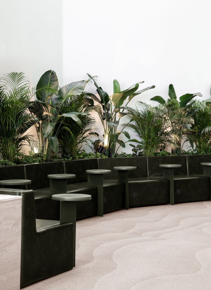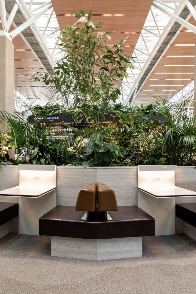 The planning, however, had to contend with a key constraint: coring into the concrete floor was not possible. The need to provide charging capabilities to every guest seat was resolved through a clever infrastructural gesture, a network of raised planter boxes that conceal electrical cabling and plugs. These planters not only bring lush greenery and texture into the space, but also define circulation paths and frame the lounge’s many seating areas.