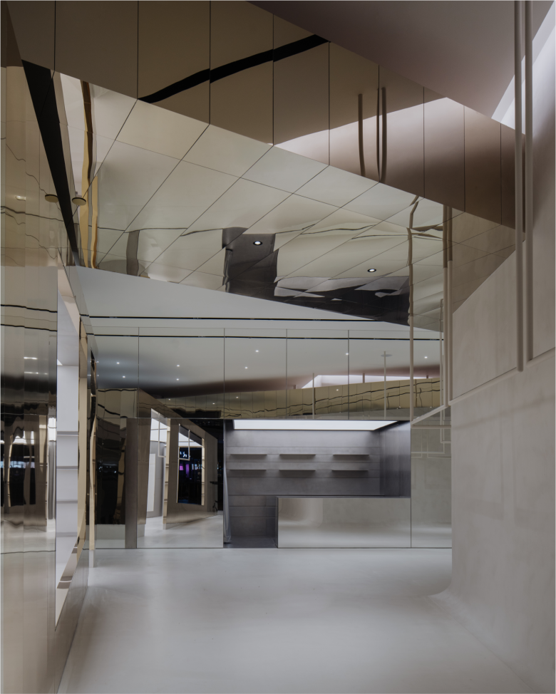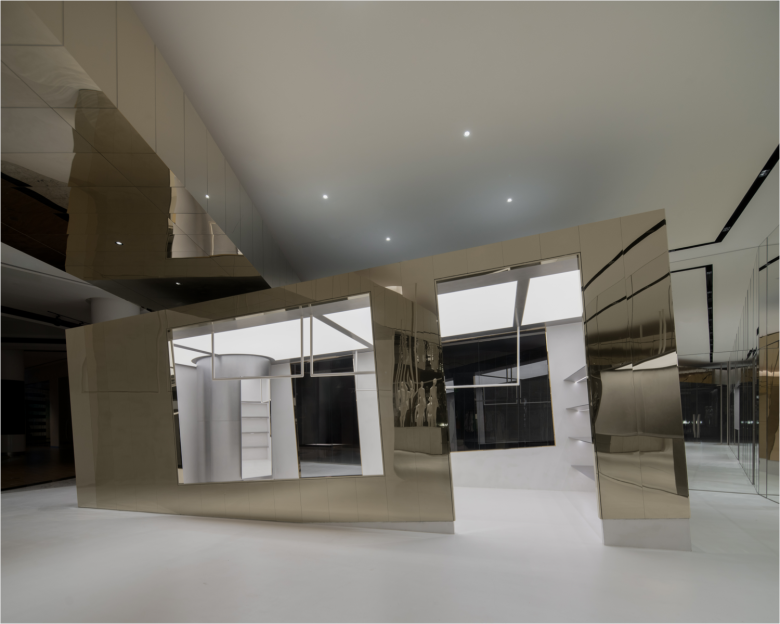 Club 21 is one of Southeast Asia‘s leading retailers, managing a string of multi-brand boutiques and branded flagship stores in Thailand, Malaysia, and at home base Singapore. It’s on home turf where Club 21 has once again expanded with an additional multi-brand boutique on the premises of Raffles City, one of the city’s many upscale shopping centres. Occupying two adjacent ground floor units measuring a total of approx. 177 sqm. (1,900 sq.ft.), the double-entrance retail space features an understated and quirky interior design by architects Lam Jun Nan and Jax Tan of local spatial design practice OPEN STUDIO. A boxy shaped volume with chunky canopy bearing the brand’s name boldly takes centre stage. Fully clad in gold-coloured mirrors, the structure, which presents a variety of coveted items, cuts obliquely through the two entryways, drawing shoppers inward.