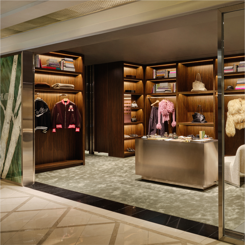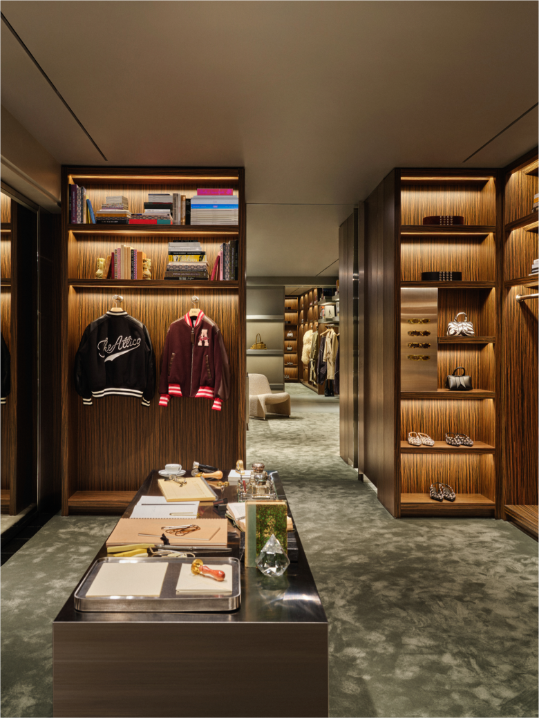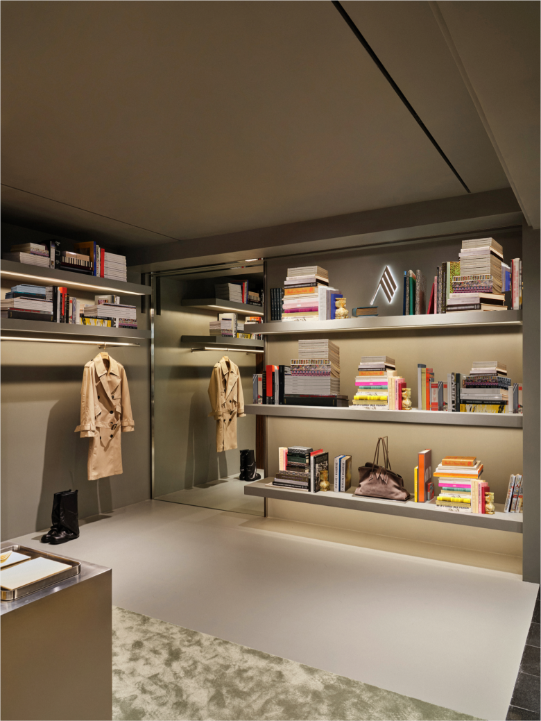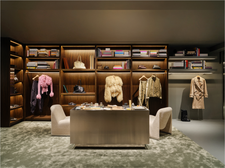 Designed in-house, the settings effortlessly live up to the theme, and are captured by dark ribbed wood panels lining the walls and built-in bookcases, and Brutalist concrete surfaces. Furnishings comprise stainless steel displays, soft green carpets, low-stitched ottomans, and vintage Alky armchairs by Italian interior and industrial designer Giancarlo Piretti. A wide range of books are used as props, backing up the design theme. The meticulously calibrated layering of materials, styles and hues oozes sophistication and aims to elevate the shopping experience. The entrance of the retail space, marked by a striking floor-to-ceiling panel of green onyx, signals the presence of THE ATTICO‘s shop-in-shop from afar. The new THE ATTICO store carries a curated selection of women’s ready-to-wear, accessories, bags and shoes. © superfuture