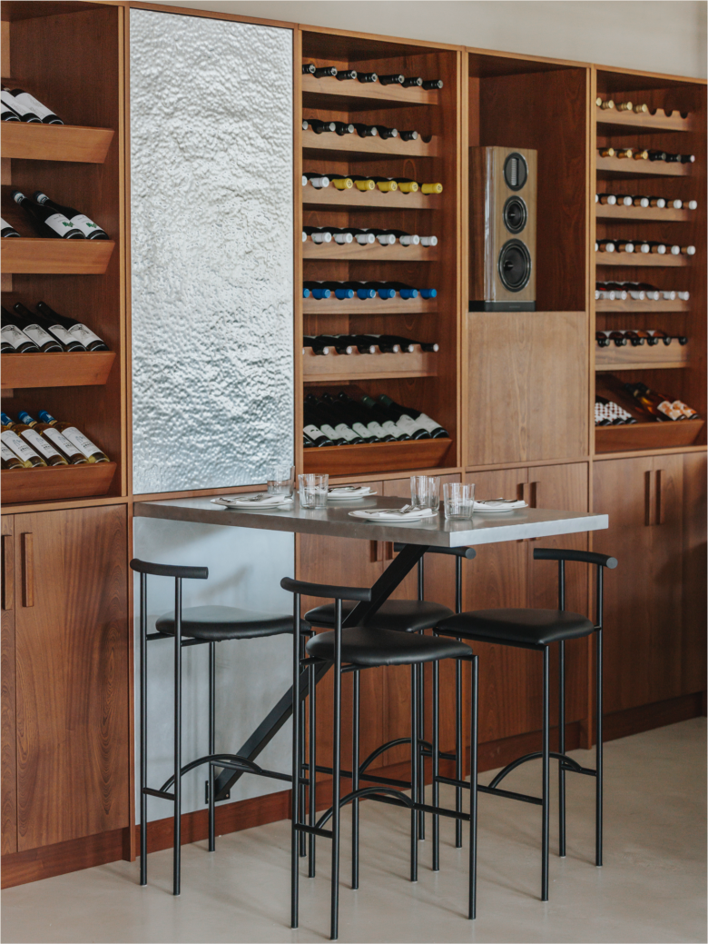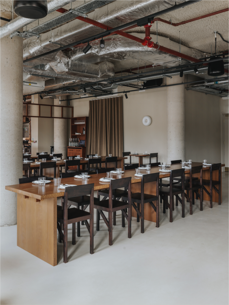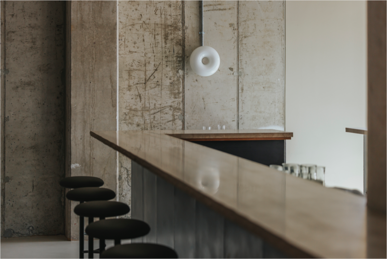 A sizeable zinc-clad bar with a marble top and stools sits on one side of the restaurant, wedged in between two support pillars. It’s flanked on one side by lacquered timber shelving units, cabinets, and bar-style seating, while directly opposite, a configuration of larger communal timber tables, and smaller metal tables with cushioned beechwood benches finished with hand-chiselled detailing can be found. The shelving units are adorned by hammered zinc panels with a dappled finish, which is a nod to the water’s surface outside. Lighting is largely captured by suspended light spots, supplemented by decorative wall sconces and chunky, paper-clad pendant lamps. Large floor-to-ceiling windows allow in floods of daylight while also allowing ample views of the aforementioned canal and the outside terrace with additional seating. The open kitchen has been designed in a similar style, allowing guests ample peeks of the staff’s culinary preparations. And speaking of food, Canal serves breakfast, lunch and dinner, celebrating the best of local and European produce while also following the seasonal cycle. © superfuture