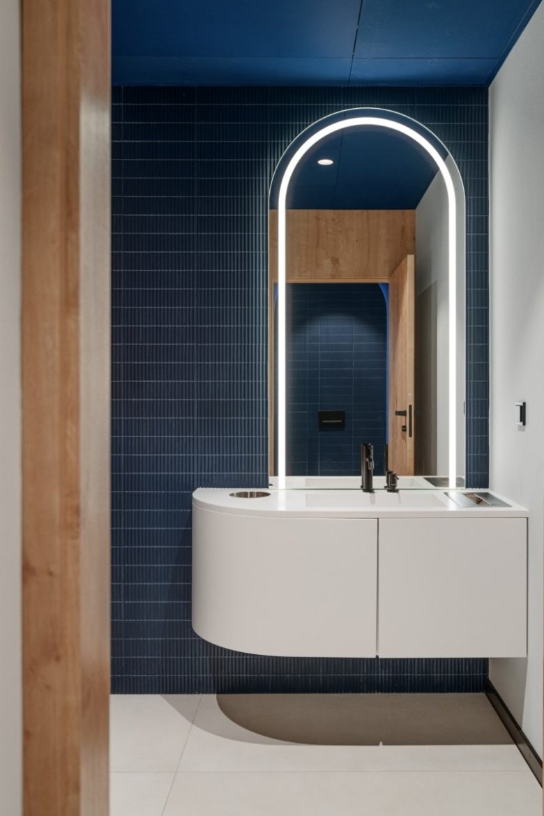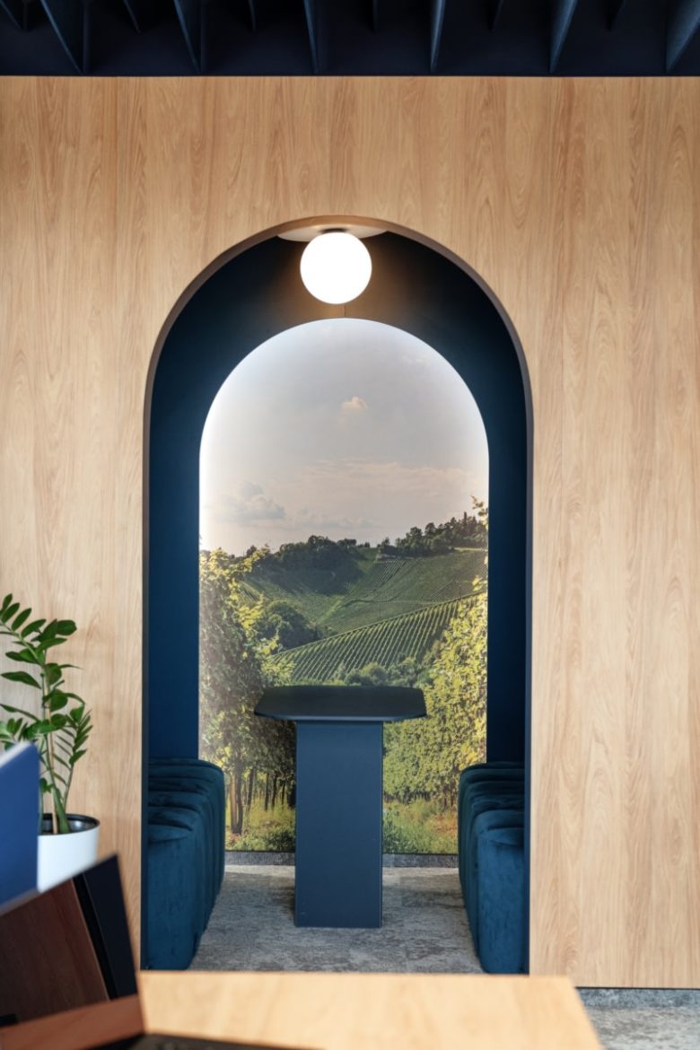 Thoughtful space divisions, custom-designed built-in furniture, wall graphics, and bespoke ceiling panels give the office a polished, consistent aesthetic. Distinctive features of the interior include rounded forms and soft lines – visible in the shapes of niches, arched door frames, floor divisions, and furniture details. A highlight is the original kitchen with a long island, covered in veneered wood and emphasized with linear lighting – a place where daily team energy is created.