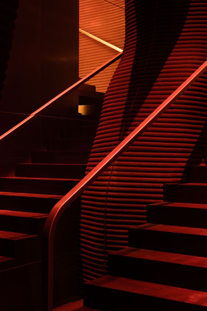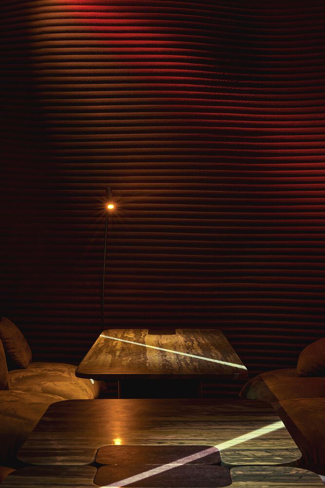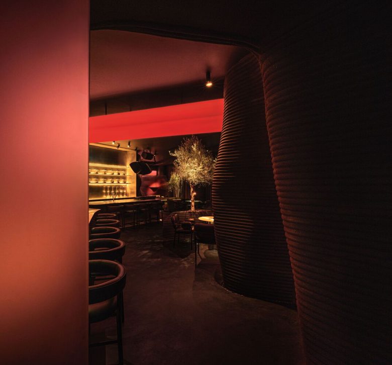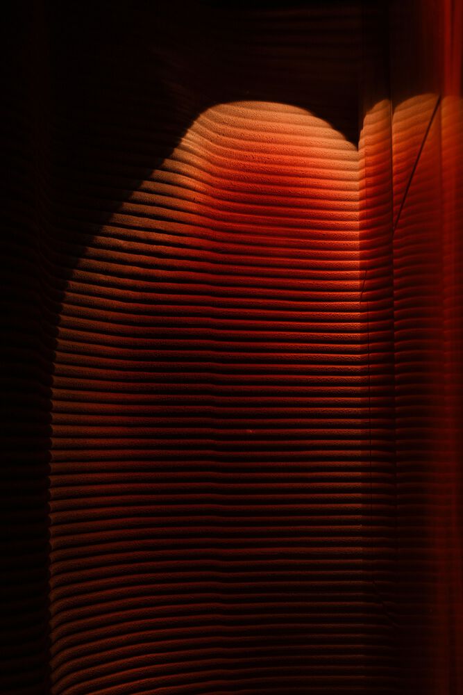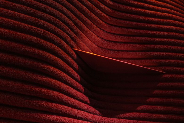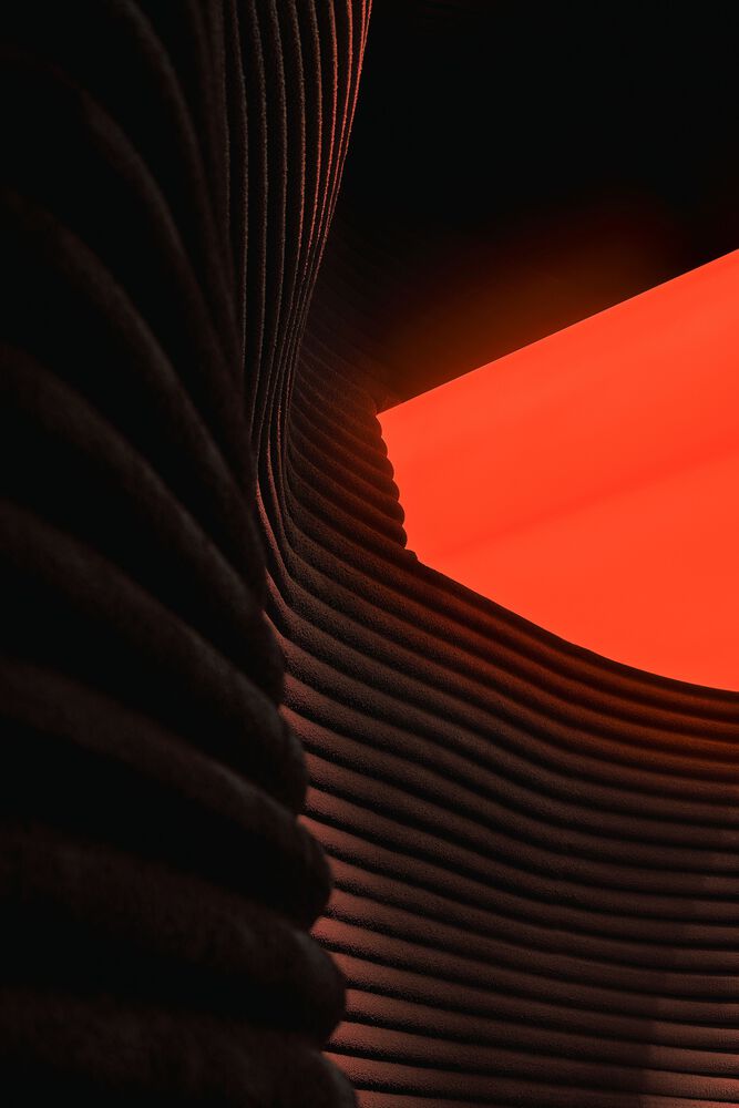 Concept – Our vision was to create a space where visitors could switch from the active rhythm of the external environment to a state of inner peace. In line with this idea, each visitor leaves the bustling, dynamic glass metropolis for a dark ‘cave’ that envelopes them in the coolness and soft natural forms. To materialize the idea, we based the interior on the image of Sand Canyon. A canyon is a constantly changing geological formation shaped by water and wind. We recreated its flowing amorphous forms running into each other in a modern interpretation. By employing 3D printing, we created whimsical fluted structures that shaped an introverted, inward-looking space. Outside, these curving, enveloping rocky structures form a terrace isolated from the city, while indoors they shape the layout, dividing the interior into separate chamber zones.