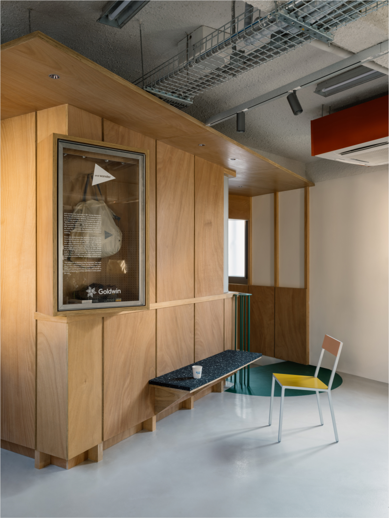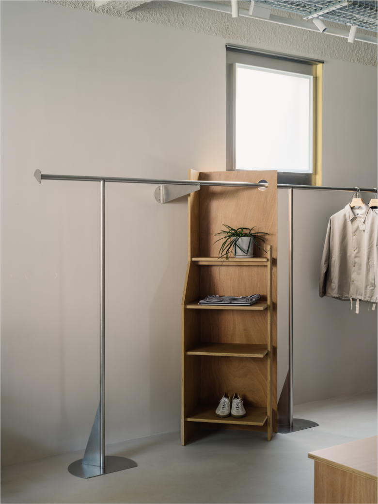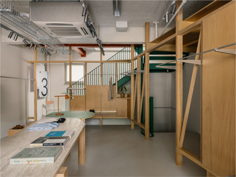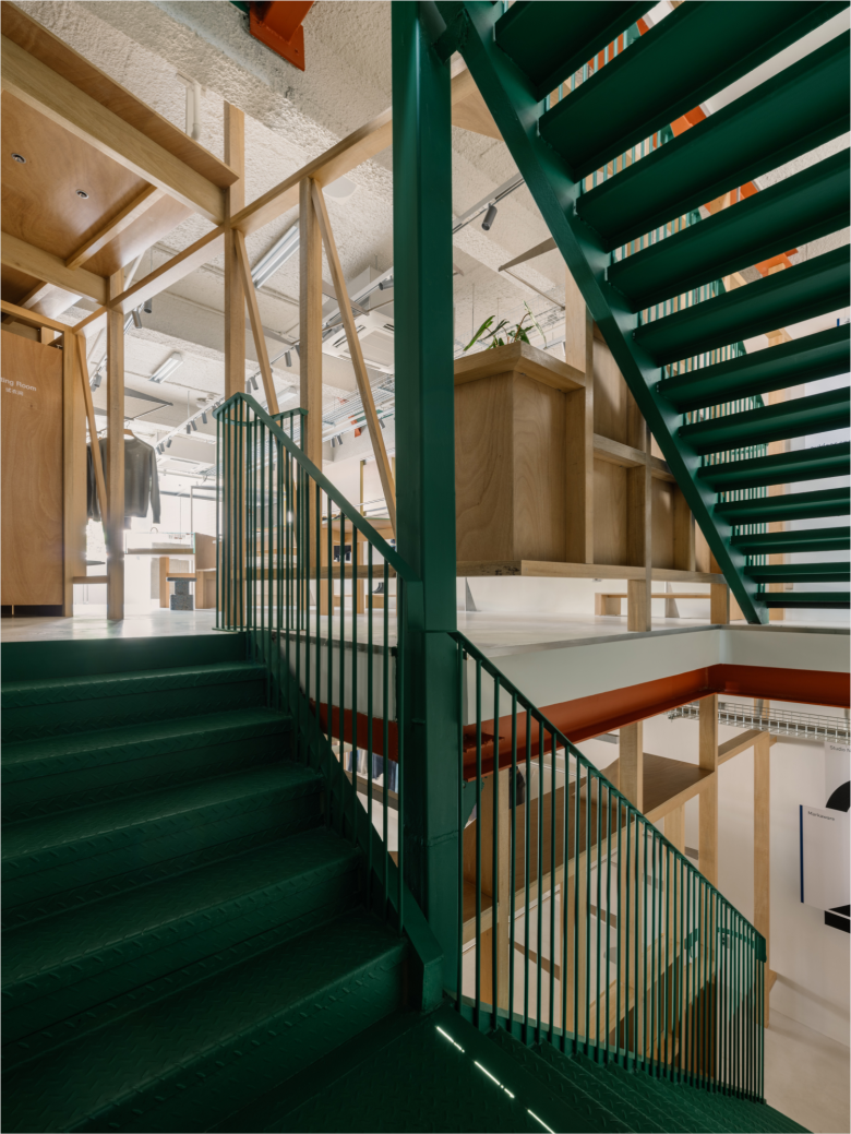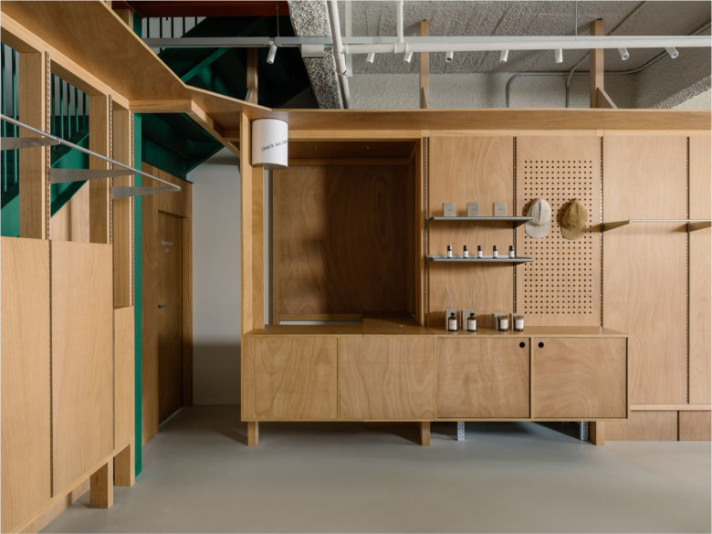 Mind you, the added structure also supports awnings and a café counter on the ground floor, while functioning as a scaffold for seasonal banners. Inside, the original rusty steel staircase has been retained and dipped in a deep green hue and paired with new railings. As said, the original architectural elements of the building have been marked and accentuated. The building’s shell is overlaid by a layering of timber fixtures, comprising floor-to-ceiling beams, panels, suspended display units, but also metal shelving and clothing racks, while also leaving intentional gaps which expose wall section and utility pipes. Also, the timber constellation houses fitting and storage rooms and display nooks. Additional furnishings include matching timber display tables and metal equivalents, in addition to moveable metal clothing racks. The design principle is only modestly repeated on the upper floors, which see a different, less ‘congested’ configurations. The renewed Element store carries a curated range of leading contemporary brands from home and abroad. © superfuture