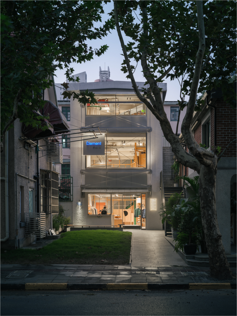 Multi-brand store Element first opened its doors on Shanghai‘s bustling Yuyuan Lu in 2019. Following a revamp two years ago, the retail space has seen another renewal, supervised by local architecture practice atelier tao+c. Occupying 225 sqm. (2,422 sq.ft.) spread across three floors of a modest 1980s structure, the new interior design is not only inspired by the building’s generic architectural elements, but also a restrained budget. Consequently, previous modifications, such as steel beams, emergency exit doors, air conditioning units, and fire hydrants are highlighted through chromatic coding. Additionally, previously sealed windows have been reopened and clad with operable metal shutters, reasserting the building’s character while revealing its traces of time. That said, the façade has been given a striking makeover as well which makes it stand out—a steel exoskeleton has been added, reaching from the ground floor up to the third floor, embedding doors, windows, and signage mounts.