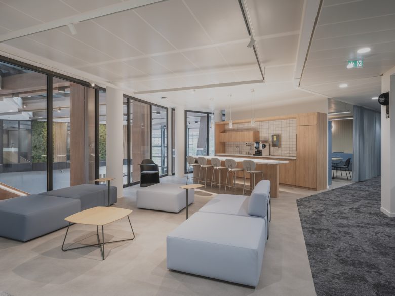 Architecture for New Ways of Working – Every element of the campus has been designed to support modern work environments and employee well-being. The fully glazed lobby offers a clear and bright welcome, while relaxation areas, collaborative spaces, and a spacious company restaurant provide comfort and flexibility. Numerous green terraces enhance the working atmosphere with nature views at every level. The tertiary entrance reinforces the site’s identity, featuring a contemporary reinterpretation of the monumental staircase that leads to dining, social, and informal meeting areas.