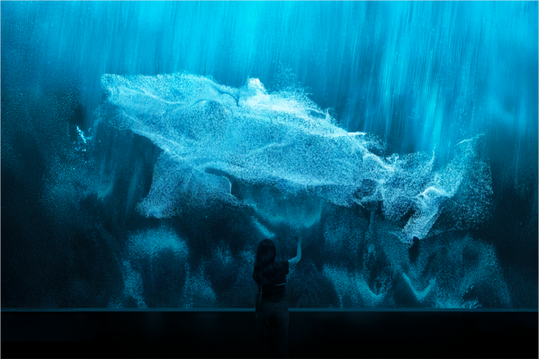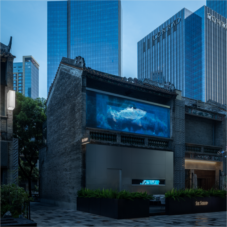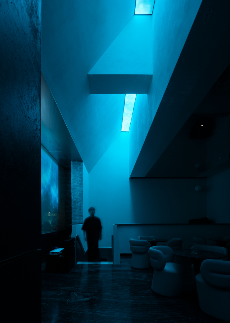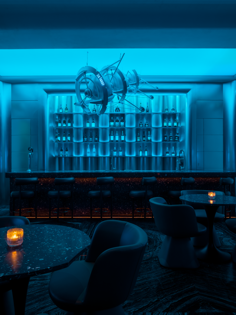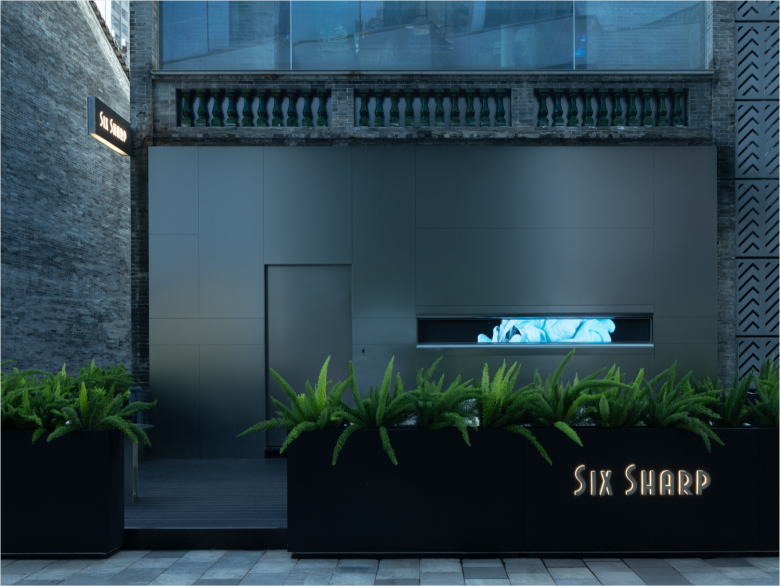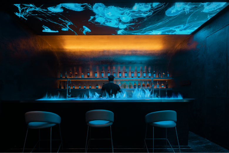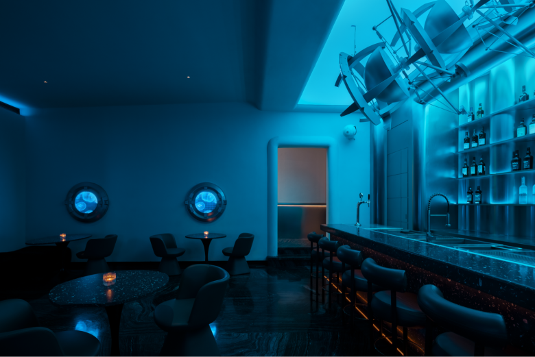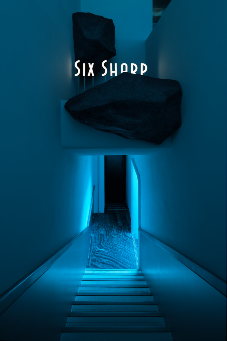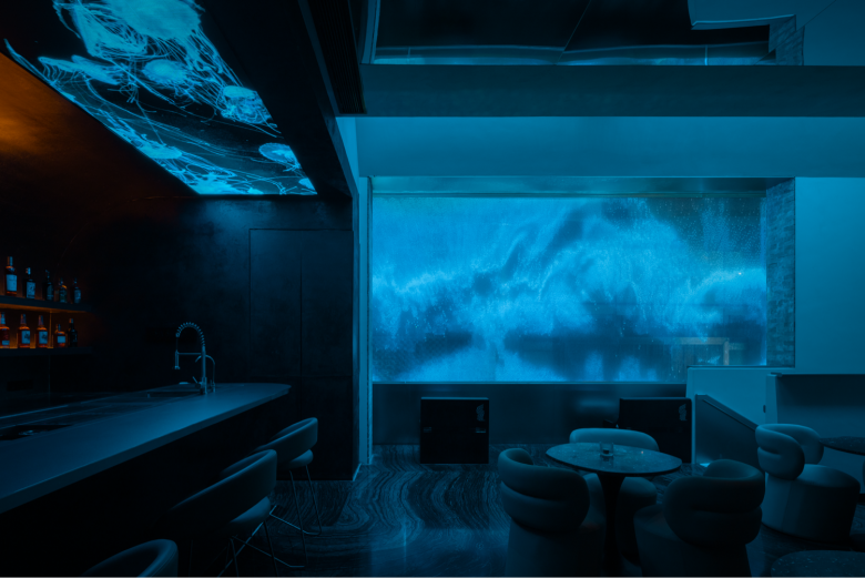 A façade clad in stainless steel panels, paired with an LED screen right on top, forms the backdrop of lush Celosia plants which demarcate the venue’s front terrace. Inside, adventurous settings unfold, inspired by marine life. The ground floor bar sees a mystical deep sea effect created by a light membrane ceiling while an intricately constructed and futuristic SIX SHARP-branded submarine installation dangles from the ceiling, adding not only a distinctive, but also a whimsical element to the setting. Water-patterned stone flooring and stainless steel columns frame the setting, which is stylishly furnished with travertine tables, rounded leather sofas and corrugated metal wine cabinets.