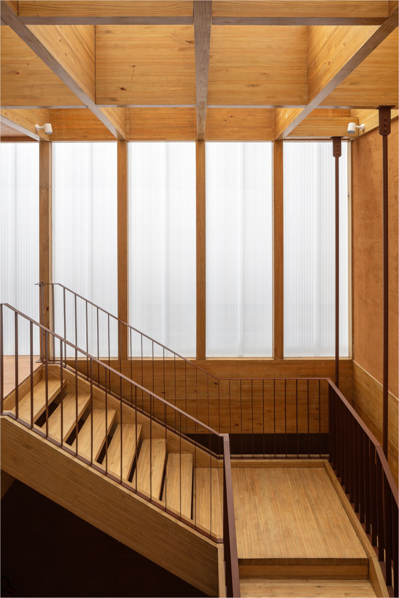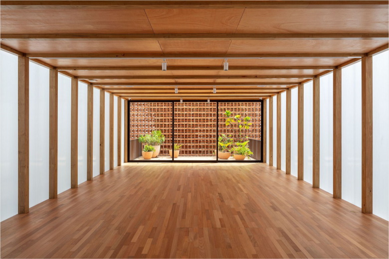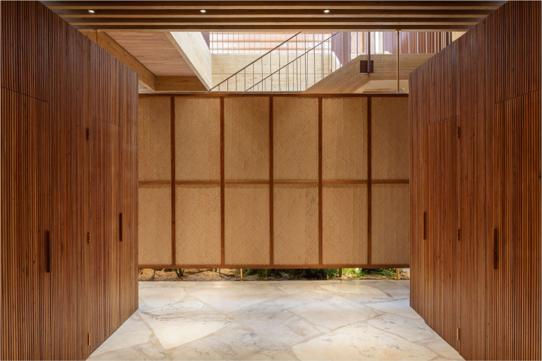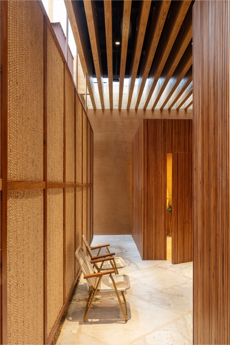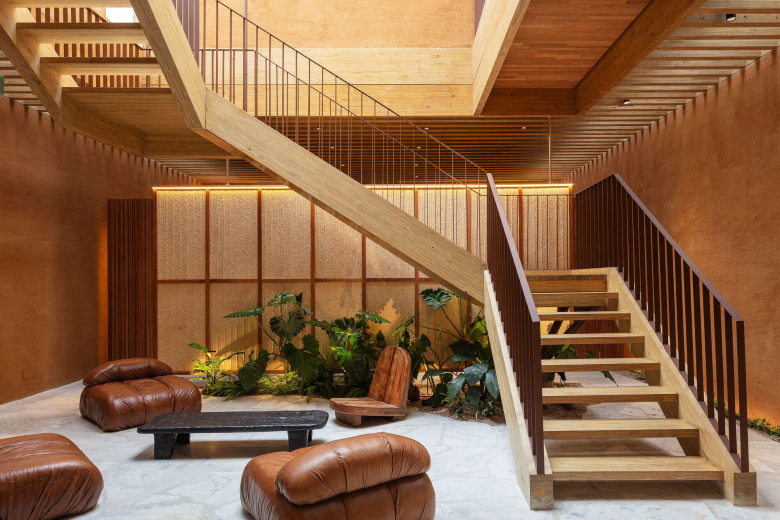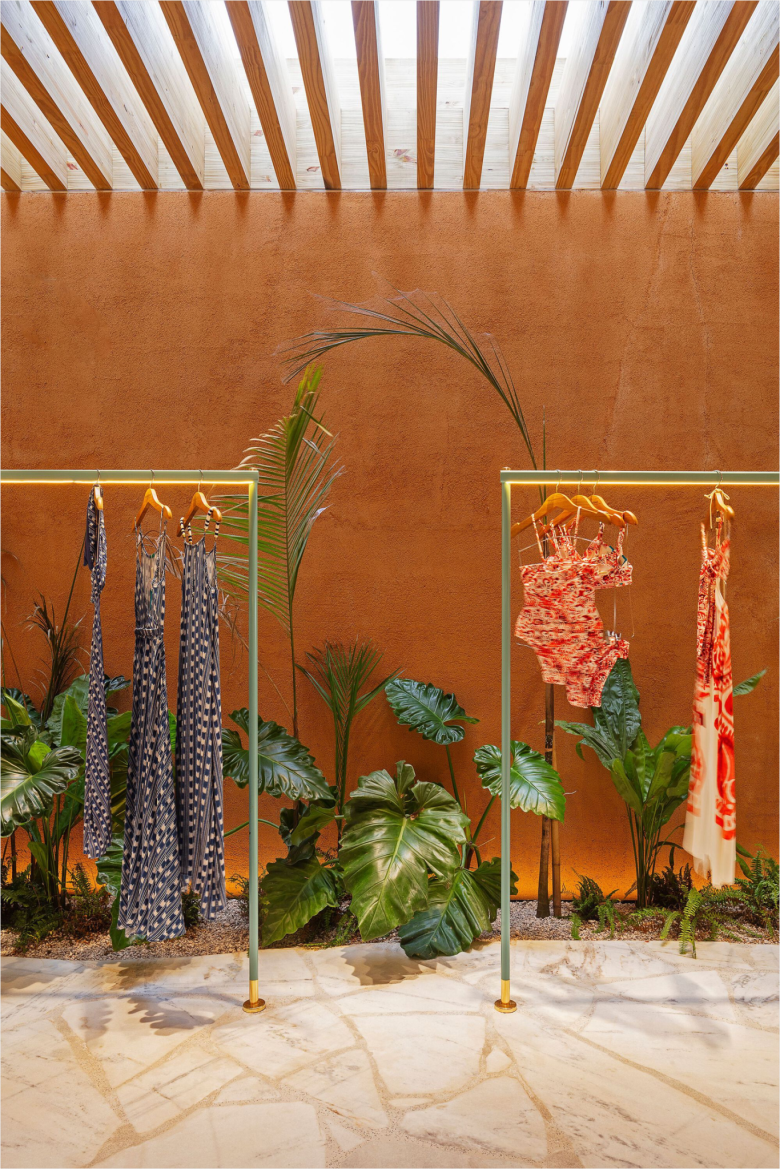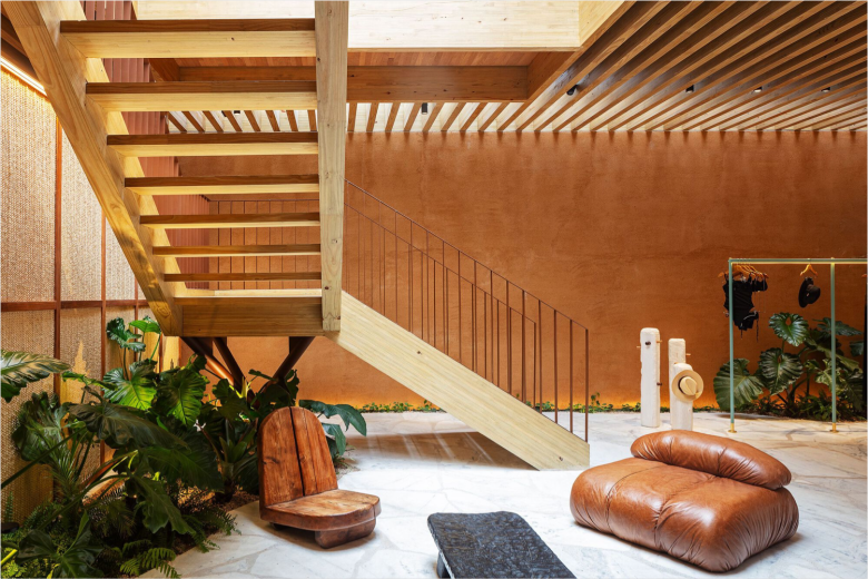 The upper floor rests on large wooden beams, but is also recessed, allowing daylight to permeate the ground floor. The cash register, warehouse, and elevator are concealed by wall of rammed earth, while a floor-to-ceiling wooden frame covered in palm leaf straw mats made by a group of artisan women from the northern Piauí region, does the very same for the four fitting cubicles. The use of this material signals a connection between Cia. Marítime and this group of artisan which thrives on the management of palm trees, promoting a positive impact on biodiversity resources. A sturdy timber staircase leads to the light-filled upper floor, which comes with an outdoor terrace, and can be used as additional retail space or for events. The new Cia. Marítime store carries the brand’s full range of swimwear, apparel, bags and accessories. © superfuture