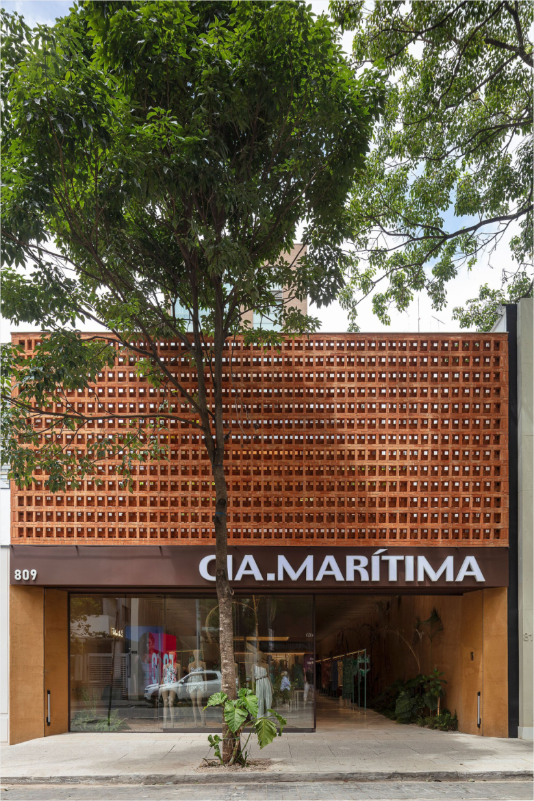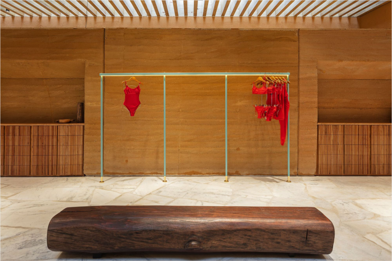 The Cia. Marítima brand – mind you, the ‘Cia.’ bit stands for ‘companhia’ or company in plain English – was founded in 1990, and has since expanded exponentially across, operating a sizeable retail network across its native Brazil. The women’s swimwear brand has no less than 24 four standalone stores in São Paulo, but seized the opportunity to open another retail space on rua Oscar Freire, undoubtedly the city’s leading shopping artery. The Cia. Marítima boutique occupies a newly built, two-storey structure with a total retail space of 592 sqm. (6,372 sq.ft.). The interior design, created by São Paulo-based architect and designer Marcelo Rosenbaum, has a sustainable edge, and incorporates an extensive palette of natural materials. The ground floor sees flooring comprising large shards of recycled Espírito Santo granite, paired with two expansive walls clad in rammed earth.
