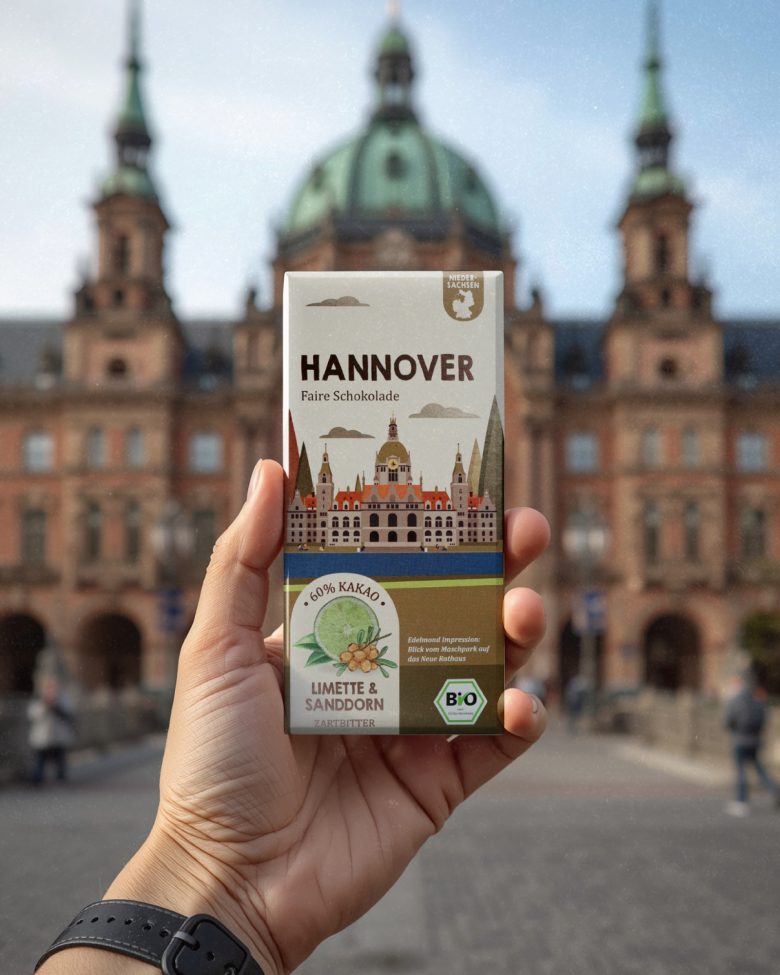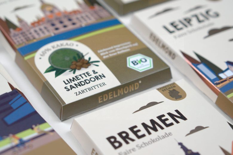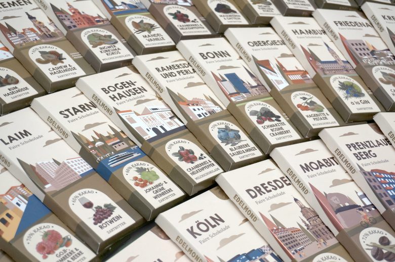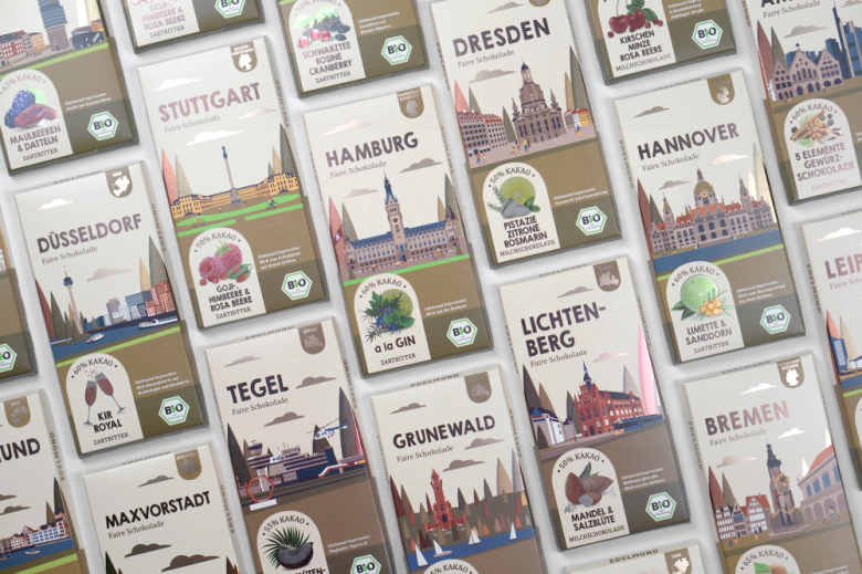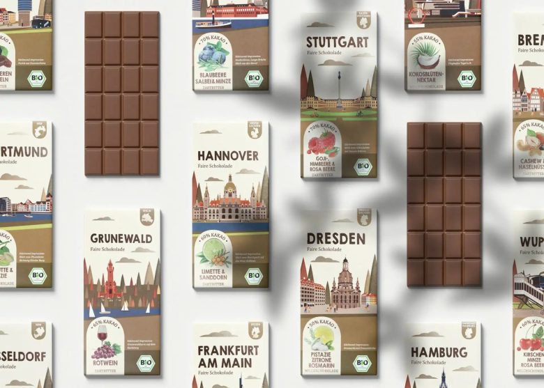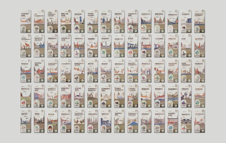 Create a design for chocolate packaging with the names of different cities in Germany and districts of Munich and Berlin and with different tastes.