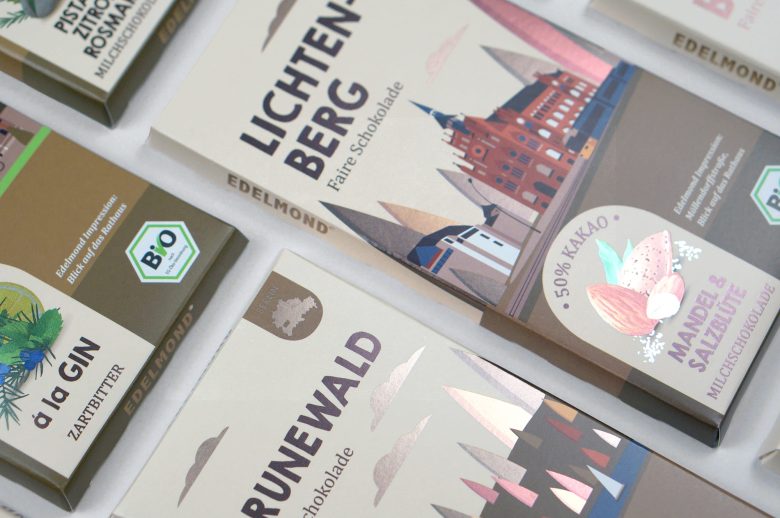 I designed illustrations for each city and region including their sights. Used the same colors and fonts. Thus, the design turned out to be uniform and recognizable for all chocolate bars.
