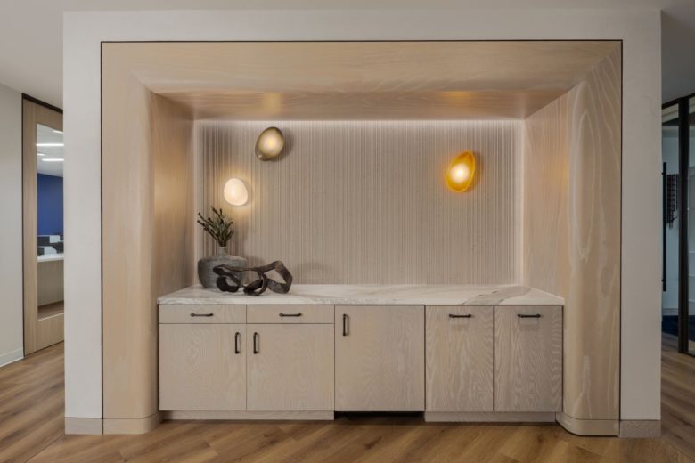 From early programming and budgeting to design, furnishings, art, and construction oversight, Convive. served as both project manager and interior designer, guiding the process from concept to completion. The 19,643-square-foot office, located in West Houston, features a spacious reception anchored by a custom blue stone desk embedded with a drill bit—a subtle nod to the industry. A geological map of Enstor’s largest asset, woven into the lobby rug using metallic fibers, sets the tone for a space where form and storytelling are deeply intertwined.