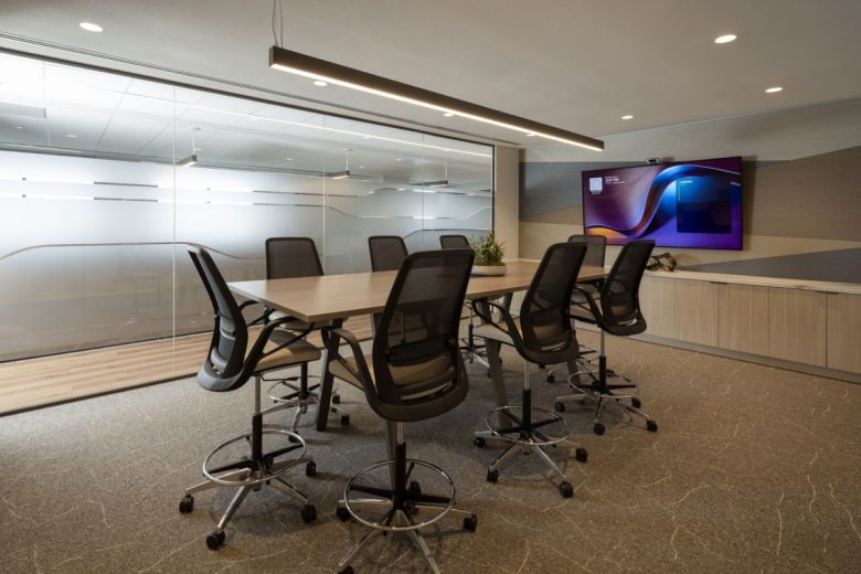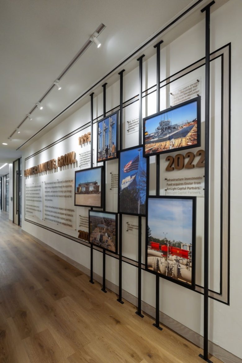 Throughout the space, materials and custom elements reflect the company’s identity and history. Custom film creates patterns on the glazing that evoke the structure of natural gas pipelines, while custom art pieces—crafted from concrete, metal, wood, and acrylic—trace Enstor’s evolution from its founding to present day. The color palette leans into the brand’s deep blues and warm metallics, used strategically to highlight architectural details and key moments in the space.