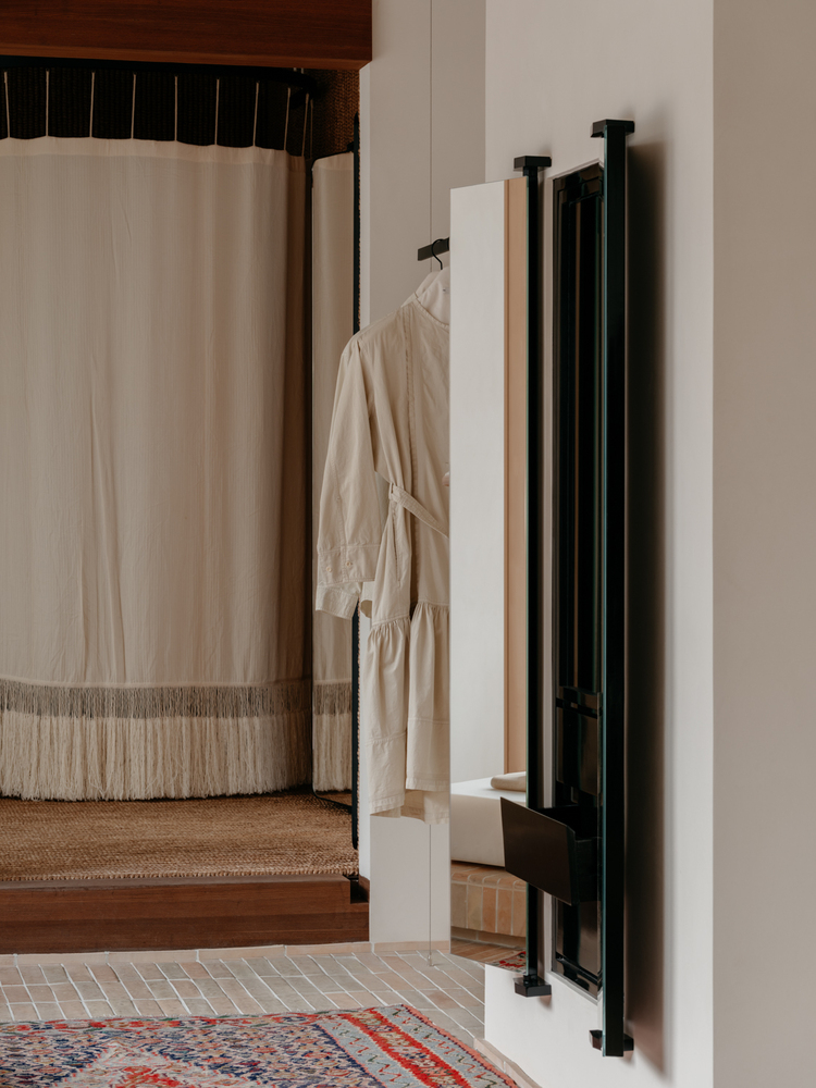 The project also takes into account the junctions between different materials. For example, in the baseboard design, inspiration is drawn from the Du Fu Cao Tang, where wooden strips are pressed onto the brick at the base of the wall. This approach transforms the baseboard into a new material layer, unifying elements such as thresholds and steps. Furthermore, the project incorporates spatial elements through construction details. Vertical panels are concealed within the door frame, and “gaps” are left on either side of the threshold to hint at their presence. Additionally, the overhead lintel is extended to serve as a wooden “hanger” for garment displays.