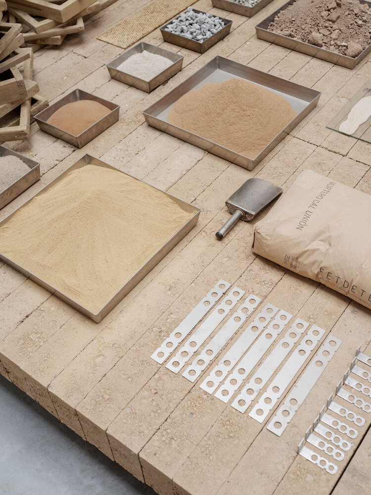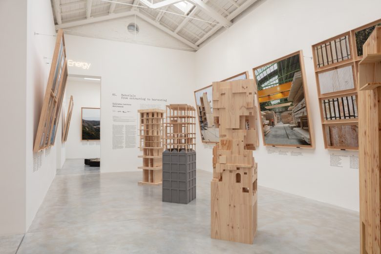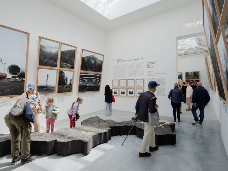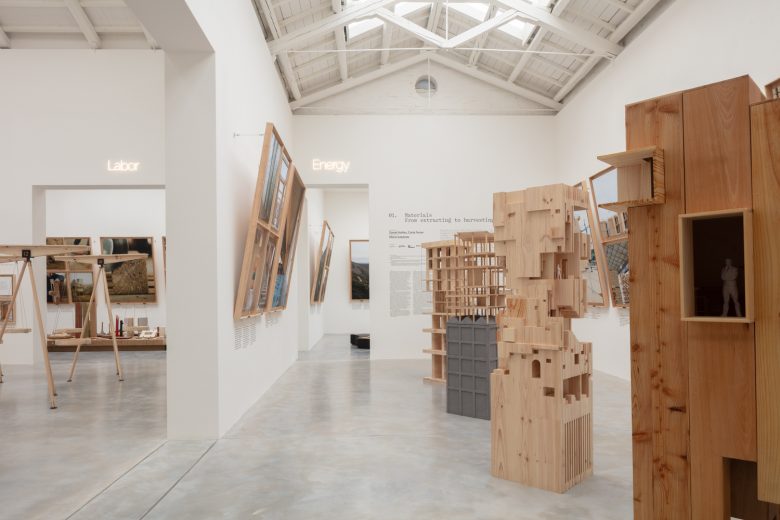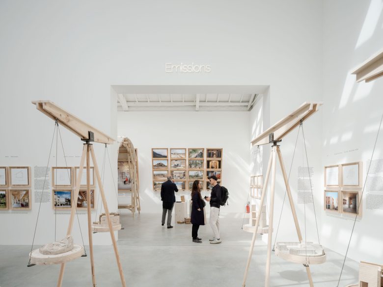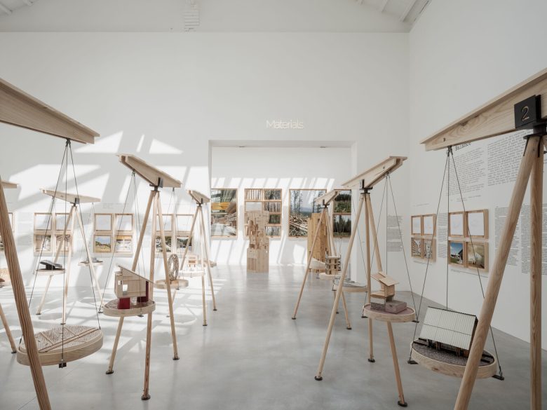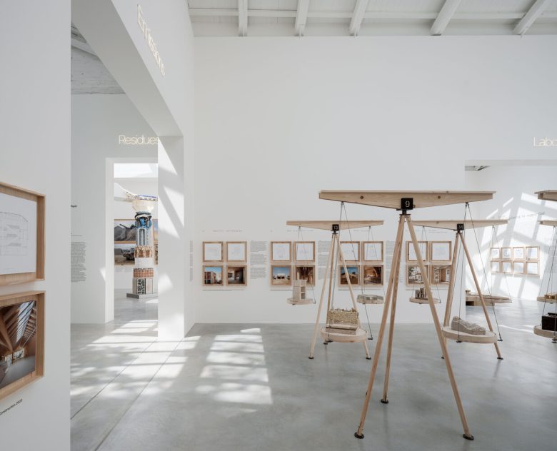 The pavilion showcases a series of works that incorporate local, regenerative, and low-carbon material palettes. The highlights include wood, stone, ceramics, cork, earth, clay, and plant fibers, along with the forests, quarries, soils, and plantations from which they originate. – The curatorial team