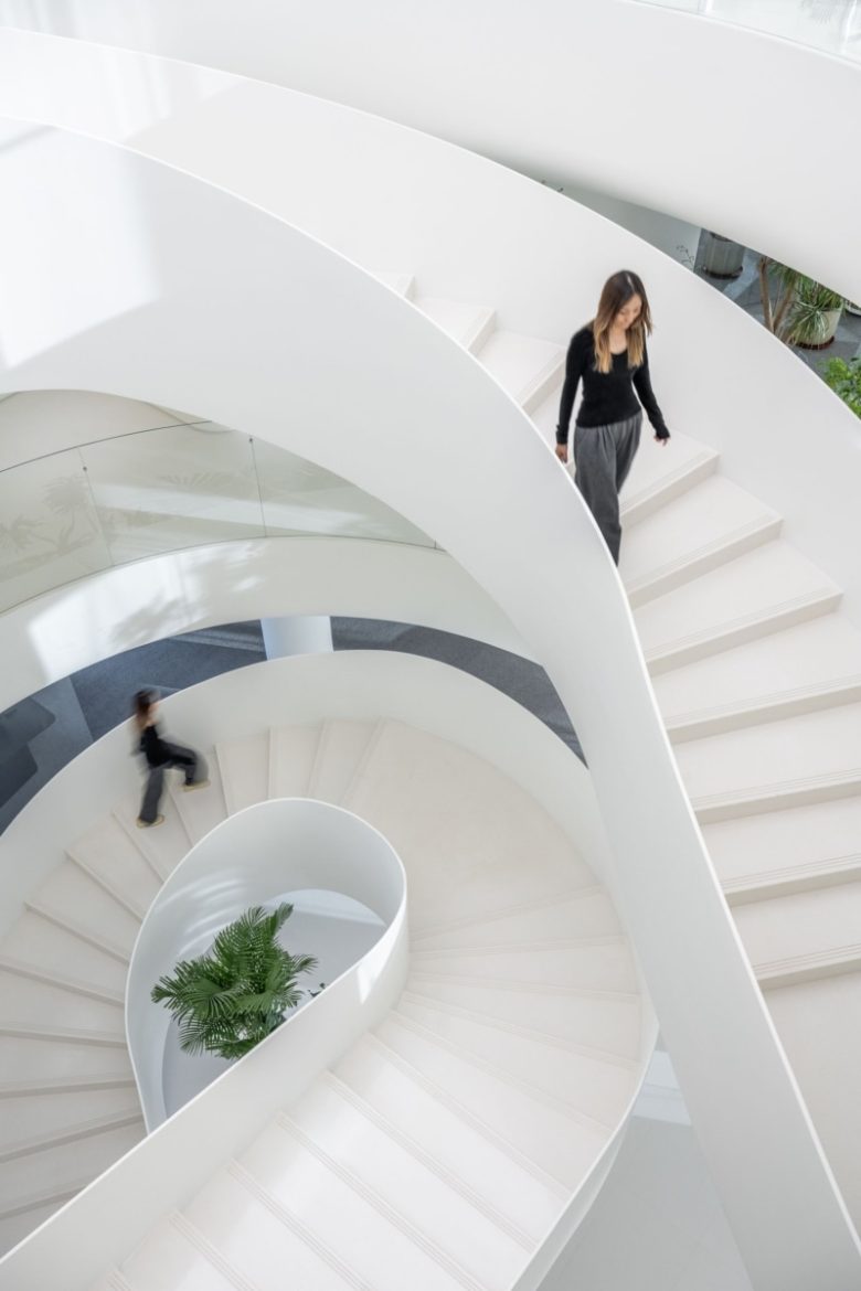 With its seamless interplay of form, materiality and spatial experience, Wutai’s new office is a space of possibility. The predominantly white interior serves as a blank canvas for staff activity and interaction, while flowing architectural lines create a dynamic environment, capable of adapting to its users. Openings in the ceiling establish visual and spatial connections between the floors, promoting a sense of openness, belonging and exchange. This infinite space extends an open invitation to think, discover and maintain physical and mental agility.