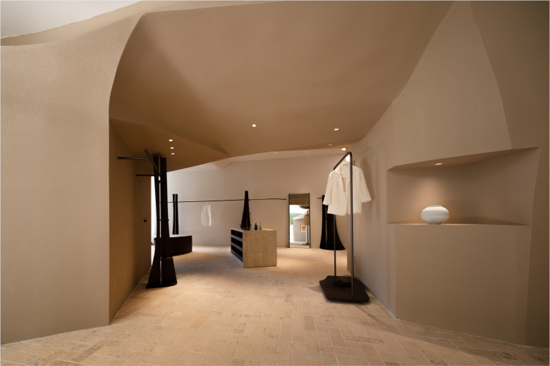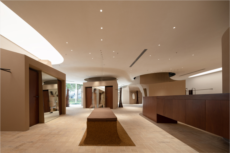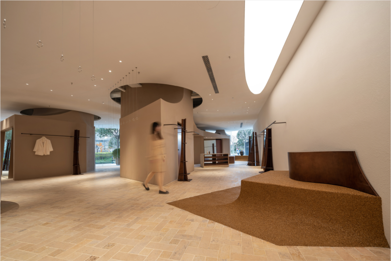 Additionally, light wells have been created in the façade, adding to the intentional and wondrous spatial disarray. The expansive MOMO ERA retail space features distinct sections—three thematic display zones, nine fitting rooms, and a radial checkout area, all linked by a fitting room-mirror-lounge-checkout circuit and limestone flooring. Each section has its own scale, enclosure, and light quality, transforming a linear shopping route into a meandering loop that incites exploration. To balance the sharp, angular visual impression of the cuán dǐng pavilion-inspired roofs, the contours of the light membrane has been shaped into soft, flowing forms that extend along the length of the space, creating an ethereal, weightless effect. Shelving units hold shoes, bags, eyewear, and other accessories, but with staggered arrangements, while freestanding display shelves dot the premises, adding even more visual dynamic to the presentation of the merchandise.© superfuture