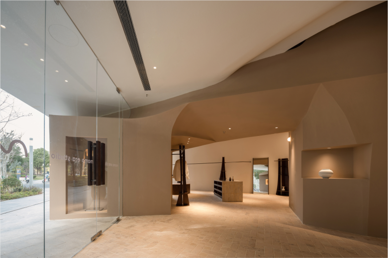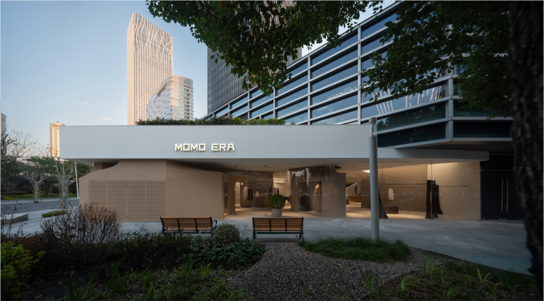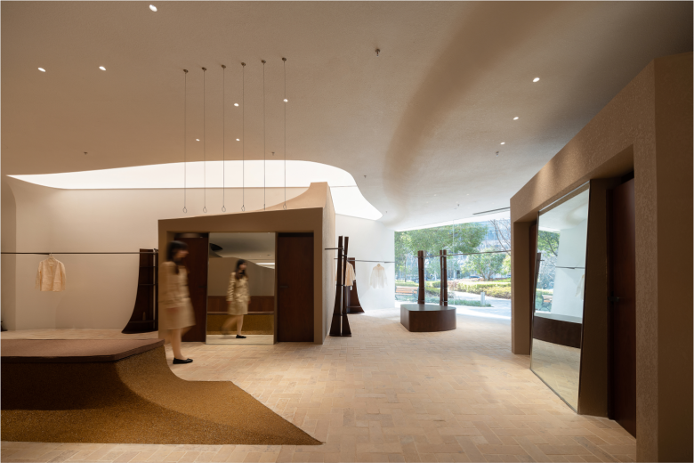 The MOMO ERA store features a series of welcoming nooks where shoppers can immerse themselves, disconnect from the hustle and bustle outside, and fully focus on the alluring merchandise on offer. The façade has also been completely altered, and now features a monumental canopy, while the the boundary between indoors and outdoors has been blurred by continuing the outside plaza’s paving tiles indoors. Additionally, a curved glass surface recesses inward at the entrance, connecting on one end to the original spatial boundary and on the other to a new volumetric element, creating an unusual spatial experience for both passers-by and shoppers when navigating the retail space. Five interconnected volumes, which house fitting rooms and storage, emerge from the site’s existing structural columns and pipelines. Each volume tapers inward near the top to draw in more natural light, evoking traditional cuán dǐng pavilion roofs, but also features a variation of load-bearing points, adding to the spatial marvel.