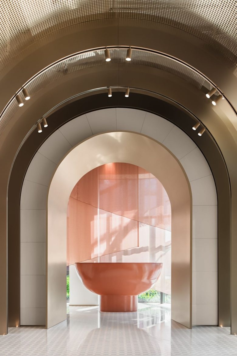 The Show Office carries the theme of exploring the energy of gathering through its five floors, beginning at the ground-floor entrance. The fluid curves of the reception desk and ceiling cut-outs encourage a sense of movement and vitality, fostering a dynamic corporate culture. A circular display at the entrance showcases flagship products, accompanied by interactive screens that narrate the company’s vision. A sculptural staircase acts as a vertical link, promoting spontaneous encounters and encouraging walking as a healthy alternative for moving between floors.