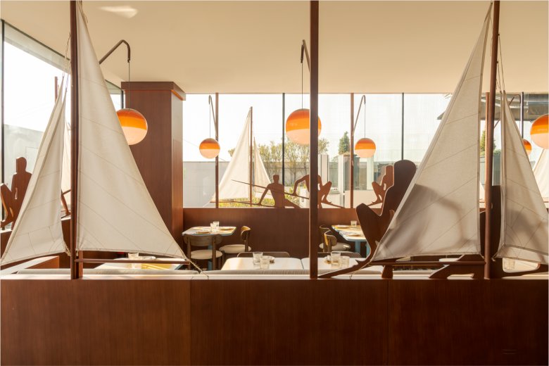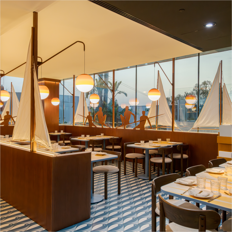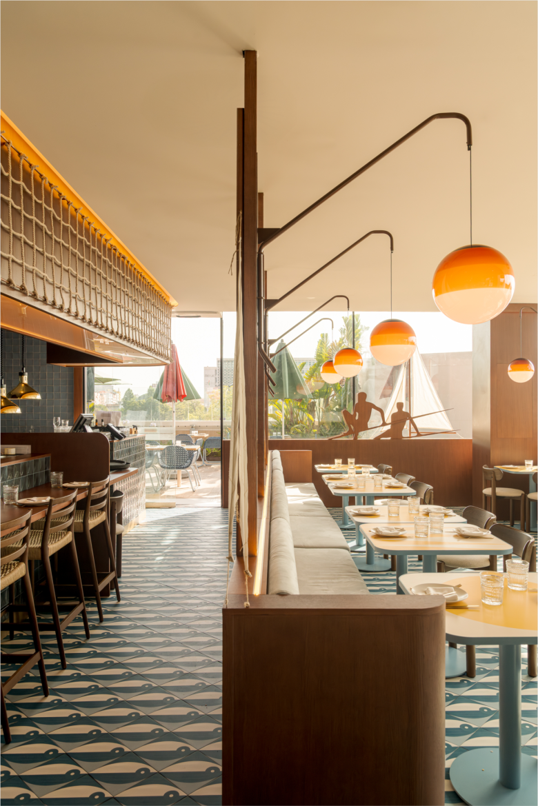 The entire demarcation of the dining area is made of wood, creating a warm, welcoming atmosphere reminiscent of sailing ships’ cabins. The warmth of the timber and a colour palette that playfully alternates between the blues of the ocean and the golden tones of the sun, or rather, the sunset, reinforce this relaxed, holiday vibe. Hovering over the space, as if dangling from fishing rods, are several of Marset‘s colourful Dipping Light luminaries, complementing this stylised, slightly romantic Mediterranean setting. The nearby bar, set below a fishnet-adorned timber canopy and separated by a narrow corridor, offers additional seating in matching style. The menu at El Mar lists a variety of fish dishes and other seafood, supplemented by side dishes, and a curated selection of cocktails, wines, and non-alcoholic beverages. © superfuture