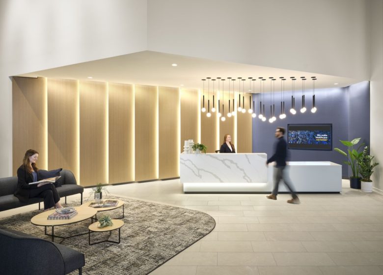Significant focus was placed on achieving a lobby design with a classical, clean first impression, utilizing new architectural wayfinding elements and a variety of finishes that connect all the floors.