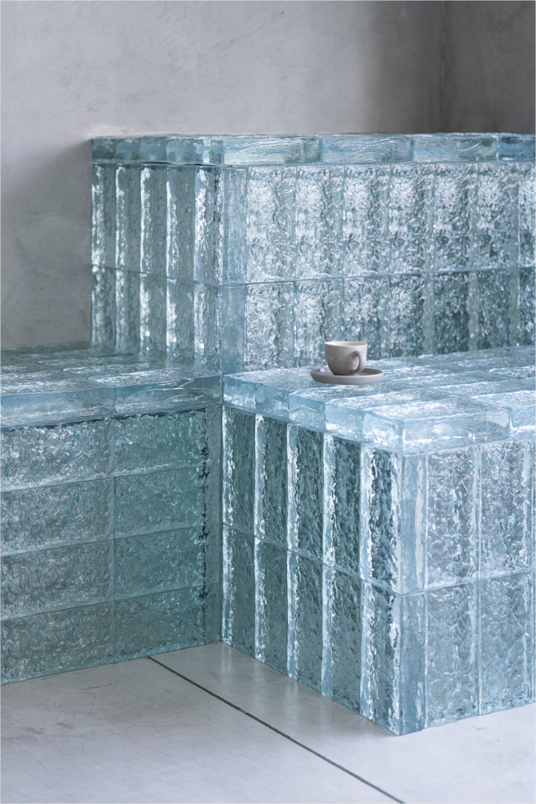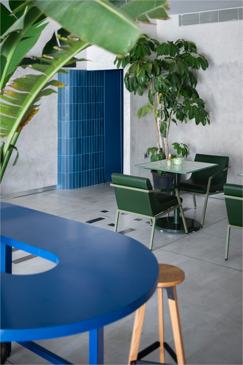 Blue is a dominant colour here, captured by the aforementioned tiles, some of the furnishings, and of course, the slats of the elongated service counter near the entrance. Additional furniture pieces come in green, and also bright red, which ties in with the menu board’s rail behind the service counter. Needless to say, the palette of bold saturated colours visually shapes the space, while also adding to the spatial experience. A nook opposite the counter sees terraced seating crafted from pixelated glass bricks, echoing the ceiling above, and infusing the setting with an element of playful lightness. The menu at the new SABHĀ café lists classic coffee concoctions, such as espresso and cappuccino, but also modern options like caramel latte and hazelnut latte, and given the tropical heat, cold coffee options. Additionally, cold brew coffees and matcha options aim to lure in the niche crowd. Supplementing the beverage range is a range of savoury bites, salads, toast with various toppings, and pastries. © superfuture