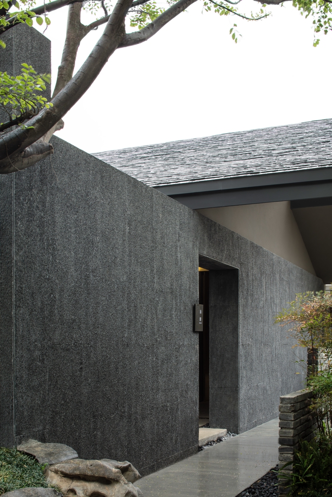 The entrance to the sauna, adjacent to the Cangyuan Garden, is separated from the public courtyard by a semi-transparent brick wall, ensuring the sense of privacy for the guests. The building’s double-sloped roof features with staggered levels and shifted cantilevers, echoing the overall architectural style of the site. This provides natural lighting for the interior while creating a rich spatial experience, echoing the garden-like layout of interpenetrating interior and exterior spaces. The two main functional areas, the spa and foot massage spaces, enclose a private inner courtyard. The exterior facade can be fully opened through folding doors and sliding windows, creating a spa courtyard that blends seamlessly with nature. In terms of the materials, in order to echo the small green tiles of Yangzhou traditional architecture and the stone landscapes of gardening characteristics, the design uses hand-carved stone tiles and textured stone to revitalize the ancient city memories with a modern approach.