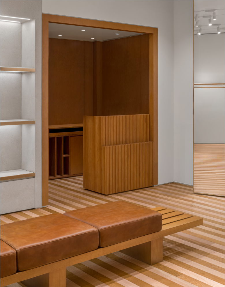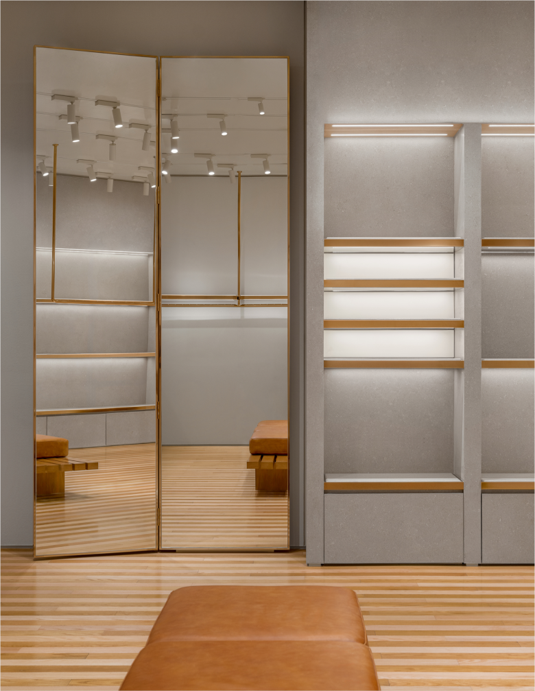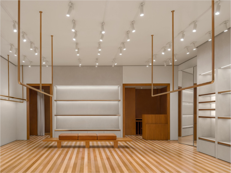 The relaxed urban silhouettes of designer Alexandre Mattiussi strike a chord with a savvy, young demographic across the planet, but it’s especially in Asia where his popularity is rising fastest. Following a string of stores in established luxury markets such as Japan, South Korea, Hong Kong and China, Mattiussi’s AMI label is expanding its footprint elsewhere, opening up shop in Bangkok, Manila, and now also in the bustling Indonesian capital Jakarta. Here, the boutique is a collaborative effort with local retail company Time International whose portfolio is brimming with international luxury brands. Nestled on the ground floor of Plaza Senayan, one of the city’s leading upscale shopping centres, the 90 sqm. (969 sq.ft.) retail space features design codes as laid down by Mattiussi and which adorn all AMI boutiques across the planet. A palette of French natural material, such as Euville lime stone, natural oak, and champagne-gold finishes is captured by window displays, cabinets, and recessed shelving. Suspended brass clothing racks offer ample display space for garments, while also adding a little shine to the setting. The new AMI store carries men’s and women’s apparel, accessories and bags. © superfuture