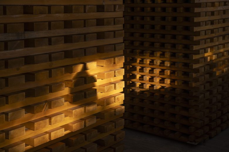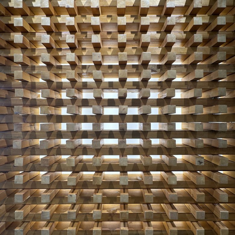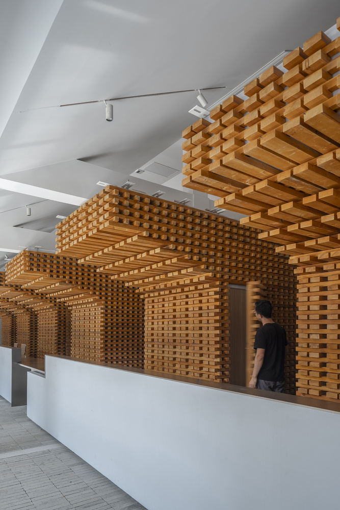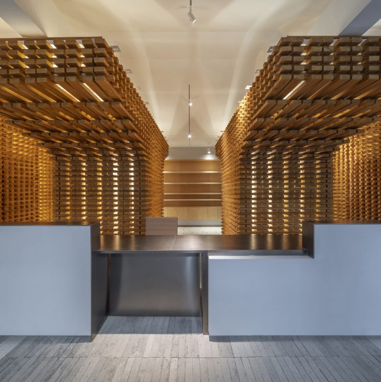 Originally, the room was a row of shops. When the partition were removed, the whole shop becomes a 27X9M entire space for tourist centre. The antiqued facade is too solid to replaced the wooden doors with transparent glazing. In the middle of room, six boxes are lined up, which not only hide the existing columns, but also serve as storage. The outside of boxes is service core. The Six boxes, stacking with wood strips facade, gradually cantilevered towards the outdoor and indoor. the shape of “arch-room” makes them looks like the bottom arcade of The Six-Tower on the central street. Combing with liner space and blue brick pavement, the renewal tourist centre is called “Street House”.