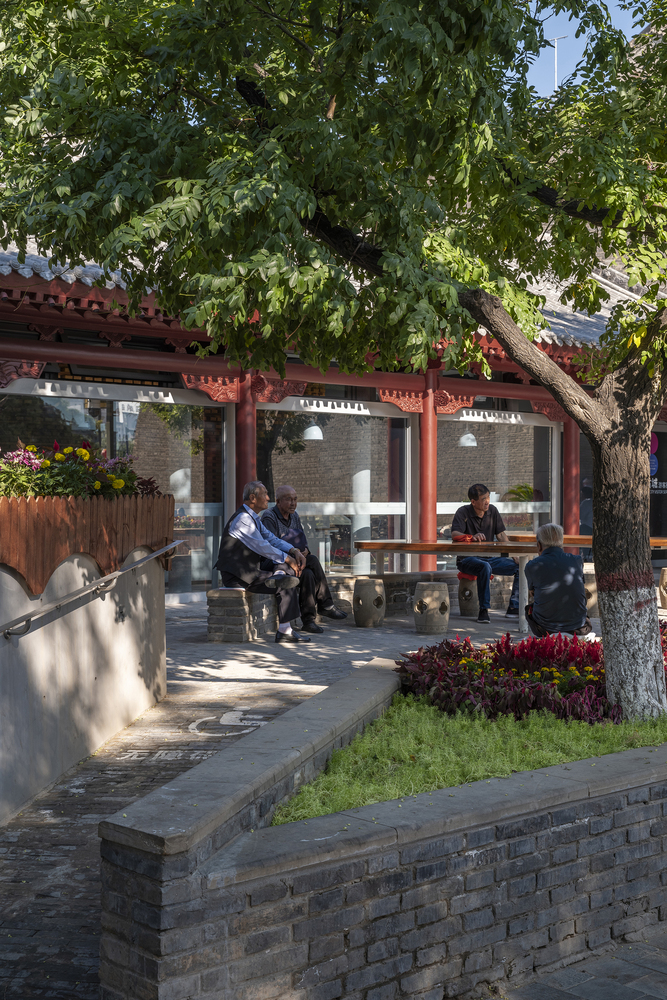The “Tree Yard” is a rectangular site with 27 x 8 meters in front of building. The three big trees almost covers the entire site. The paving materials are recycled blue bricks, which contrast with the modern transparent glazing facade. Fixed seats are placed under the shade of trees to form a leisurely “tree yard” .