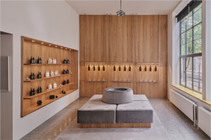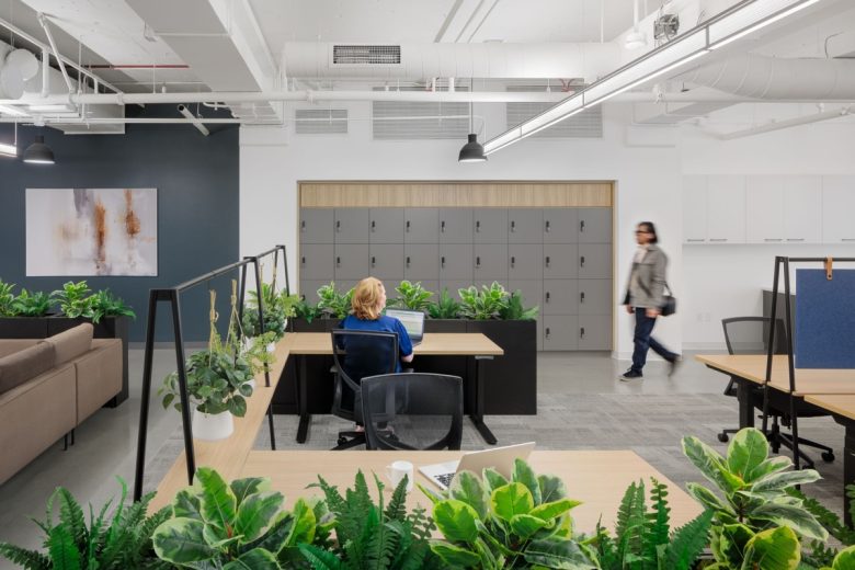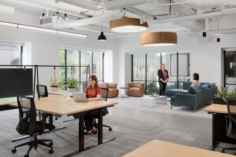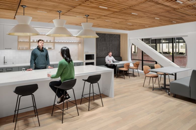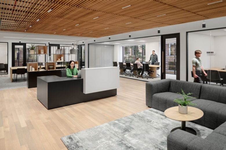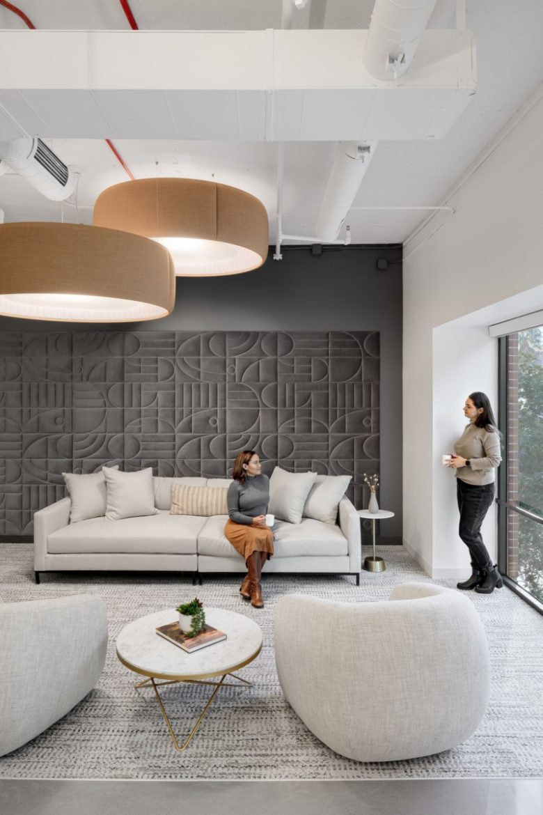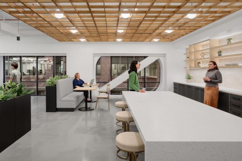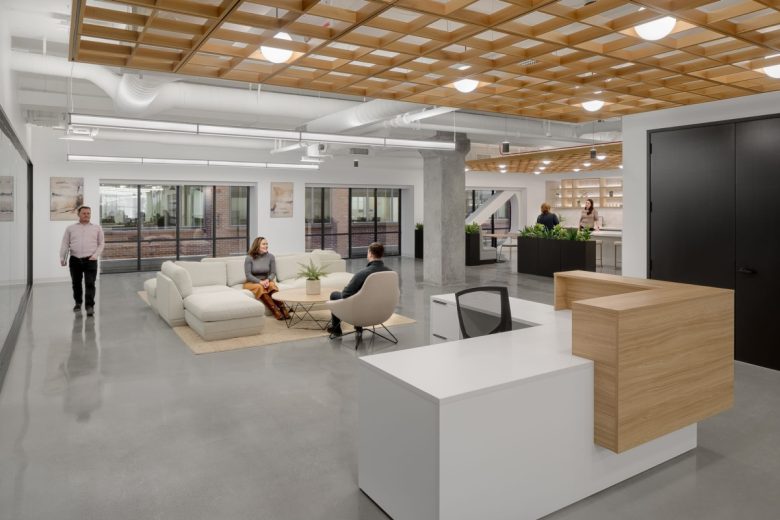 A key challenge was integrating the building’s perimeter structural braces and low windows while creating openness and height. Existing elements were selectively retained and reimagined, preserving ceiling grids, repurposing doors with fresh finishes and hardware, and strategically using cloud and open ceilings to create variation in height and volume.