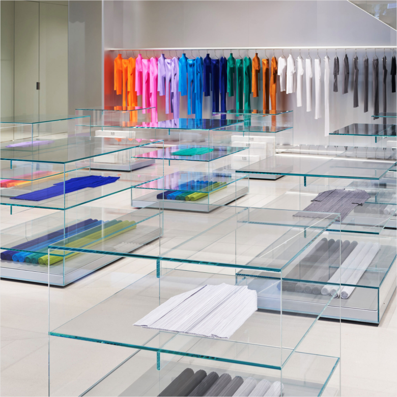 In 2009, the PLEATS PLEASE ISSEY MIYAKE retail space first opened its doors in Tokyo‘s upscale shopping district of Aoyama. Last week, the store moved a few doors down the road – Miyuki dori, to be precise – to bigger premises. Occupying three voluminous, light-filled floors of the brand new Palace Miyuki building, the store features an interior design by acclaimed Tokyo-based architect and longtime ISSEY MIYAKE collaborator Tokujin Yoshioka. The design codes are rooted in Yoshioka’s long-standing vision of a translucent space through a refined combination of glass and aluminium. On the ground floor, a large floor-to-ceiling wall displays a range of glass-encased colourful garments like art and is paired with a rigid configuration of twelve glass display cabinets, while garment display units flank the setting on two sides. Specially structured hanger rods, designed to make the clothing appear to be floating in midair, express the lightness of the collection. Here, the PLEATS PLEASE ISSEY MIYAKE collection is presented, while one floor up, more apparel, accessories and bags can be found. The third floor accommodates a super sized fitting room. In celebration of the store opening, the limited-edition Aoyama Colours collection has been released, which includes tops, cardigans and pants. © superfuture