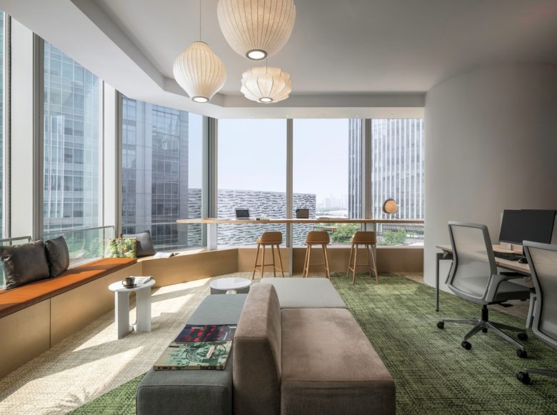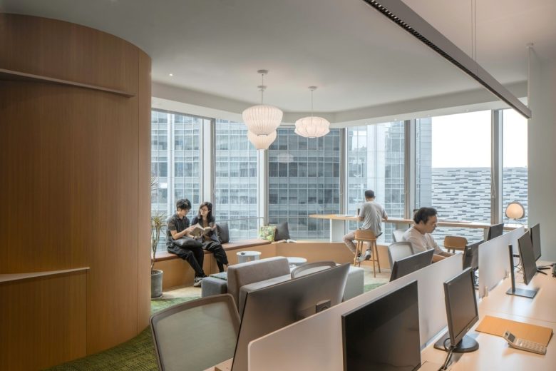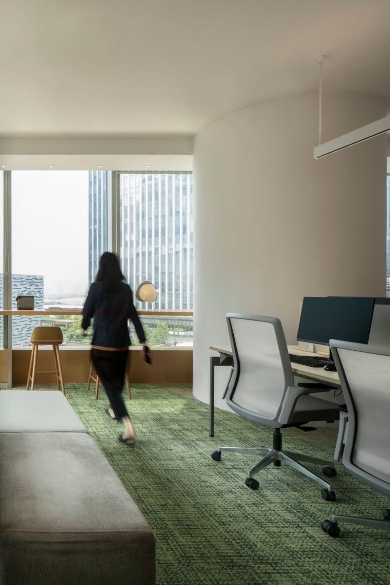 The design, centered on the concept of “Sunshine Park,” seamlessly integrates natural elements with a culture of open collaboration to craft a workspace that is both functional and emotionally resonant. Wooden slat ceilings establish a warm atmosphere, while natural light, greenery, and soft color palettes move beyond the rigidity of conventional office settings. Light-toned wood furniture paired with green carpeting fosters a relaxed yet productive environment. Interior plantings echo the cityscape beyond the windows, creating a dynamic dialogue between indoors and outdoors.
