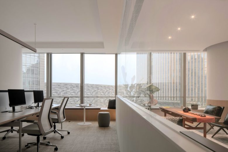 The window-side area is envisioned as a observation bar, drawing the city views into everyday work life and fostering relaxed interactions. Blurring the boundary between work and leisure, it enriches the office environment with a lively rhythm. The manager’s office and reception area are framed with transparent partitions, balancing privacy with visual openness, while artworks, leather seating, and warm lighting contribute to a relaxed yet refined business atmosphere.